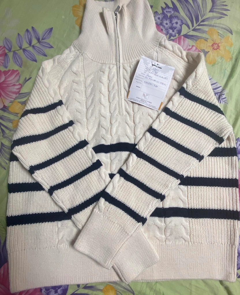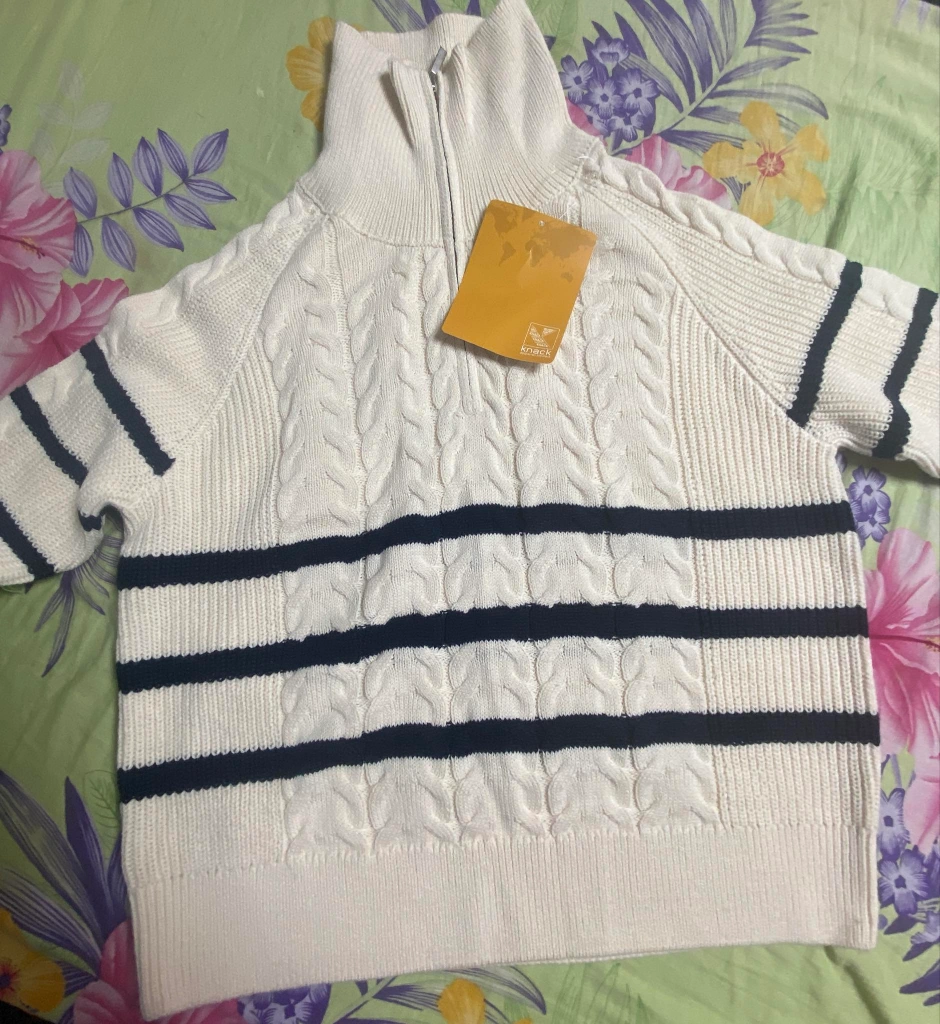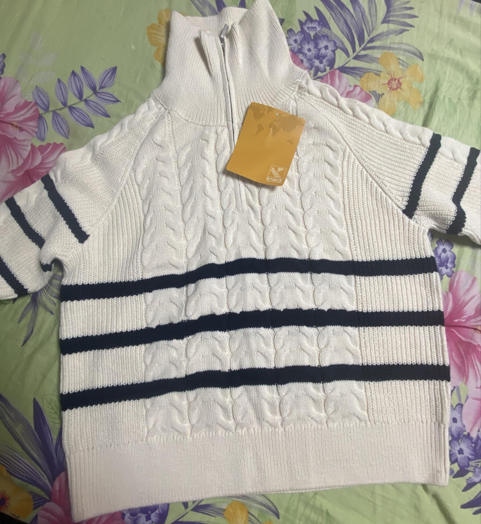 Cozy up in this Source Apparel knit sweater! It's a stylish white sweater with navy blue stripes, perfect for adding a touch of nautical charm to your wardrobe. The sweater features a comfortable, slightly oversized fit and a quarter-zip neckline, making it easy to layer. The cable knit detailing adds a classic touch. it's brand new with tag.