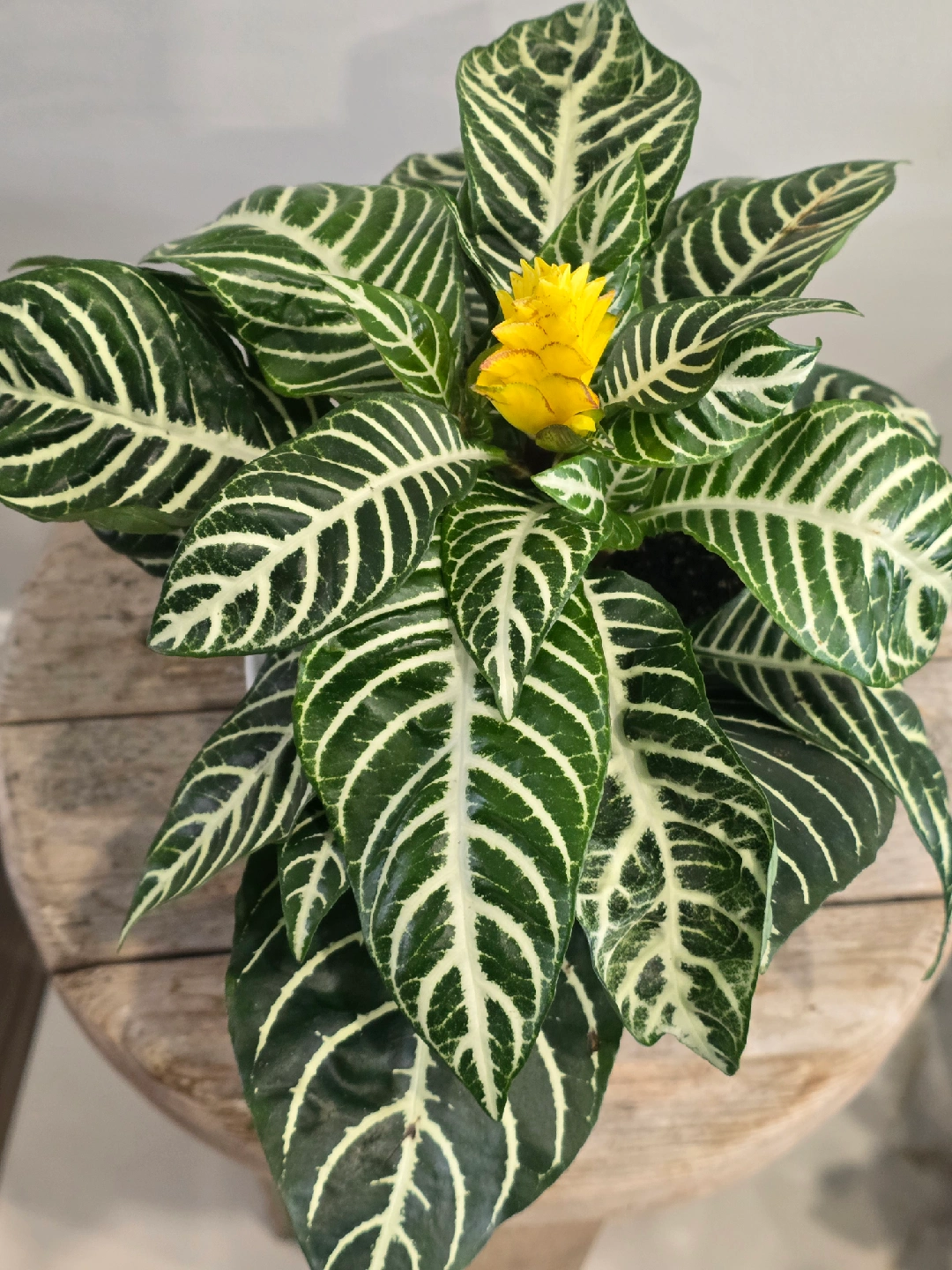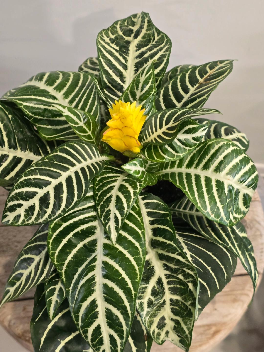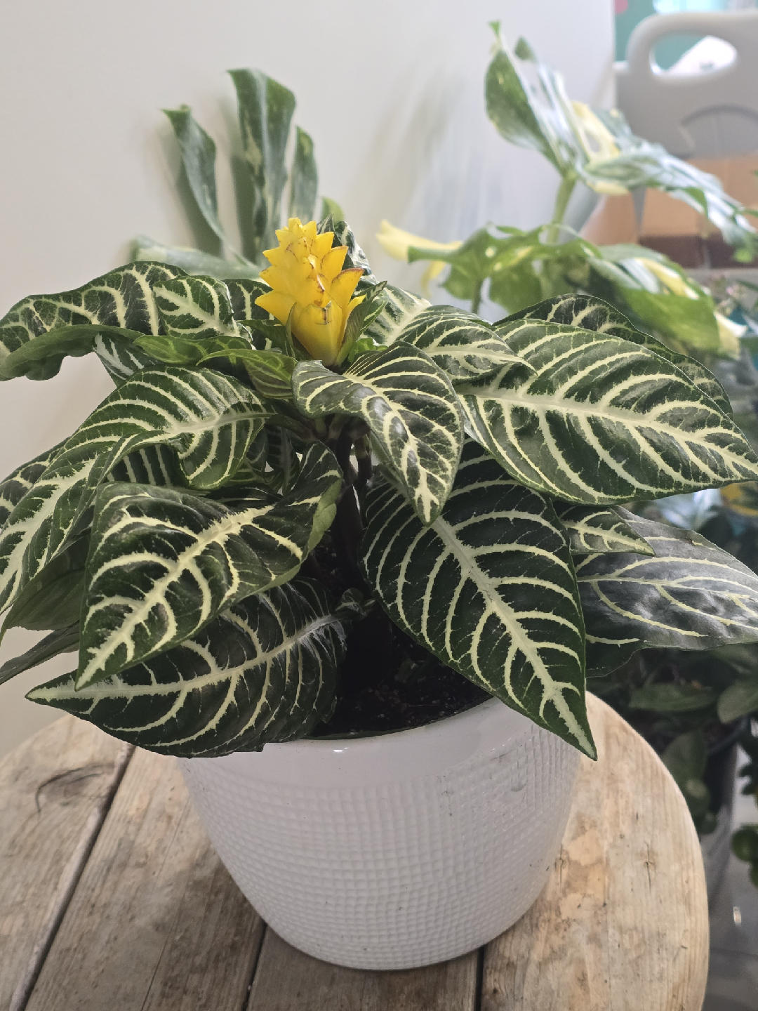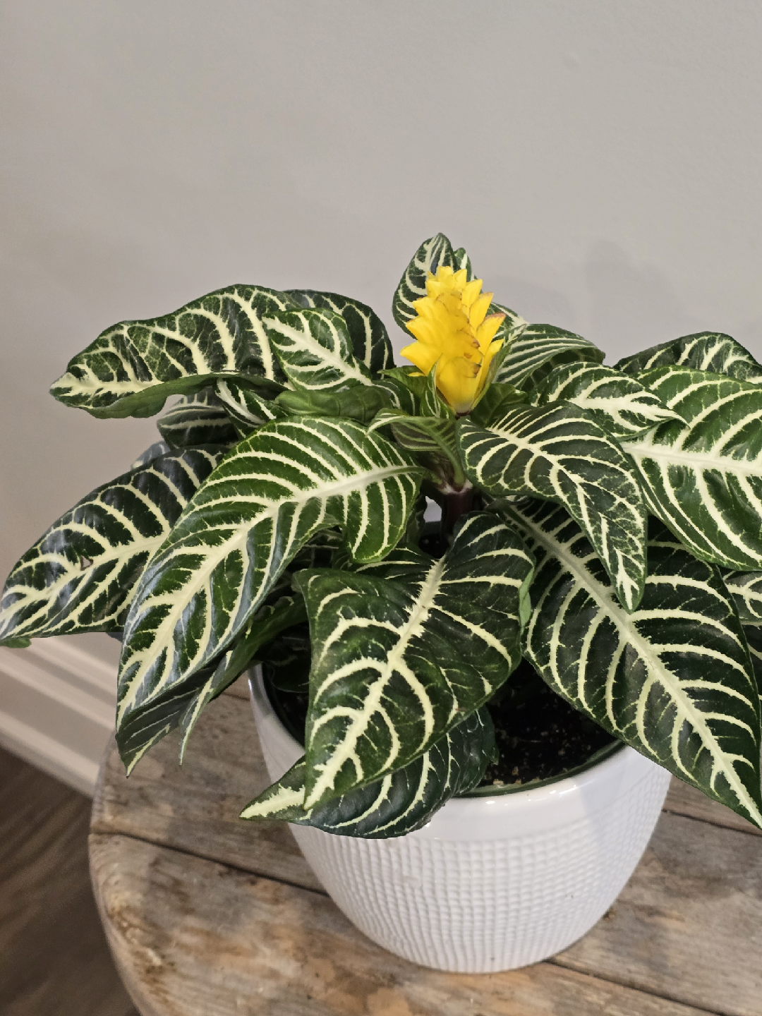 I'm selling a beautiful zebra plant, also known as Aphelandra squarrosa. It features striking dark green leaves with white stripes and a vibrant yellow flower. It's in great condition and would make a lovely addition to any home or office!