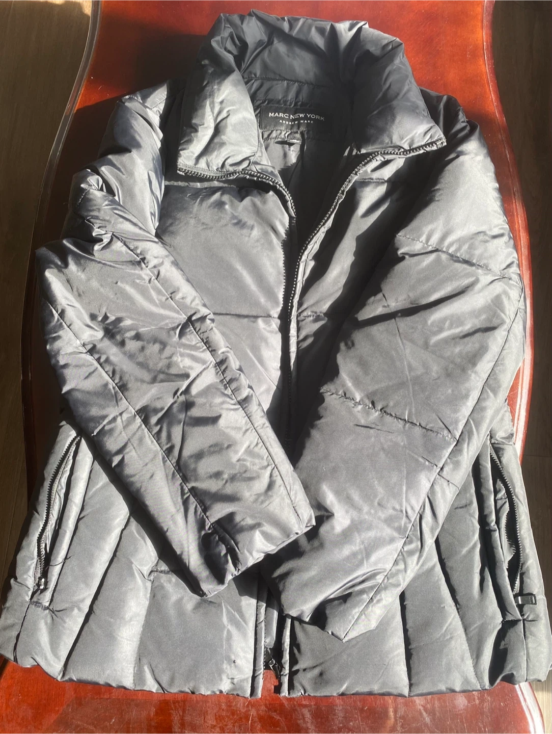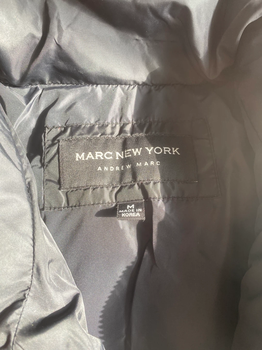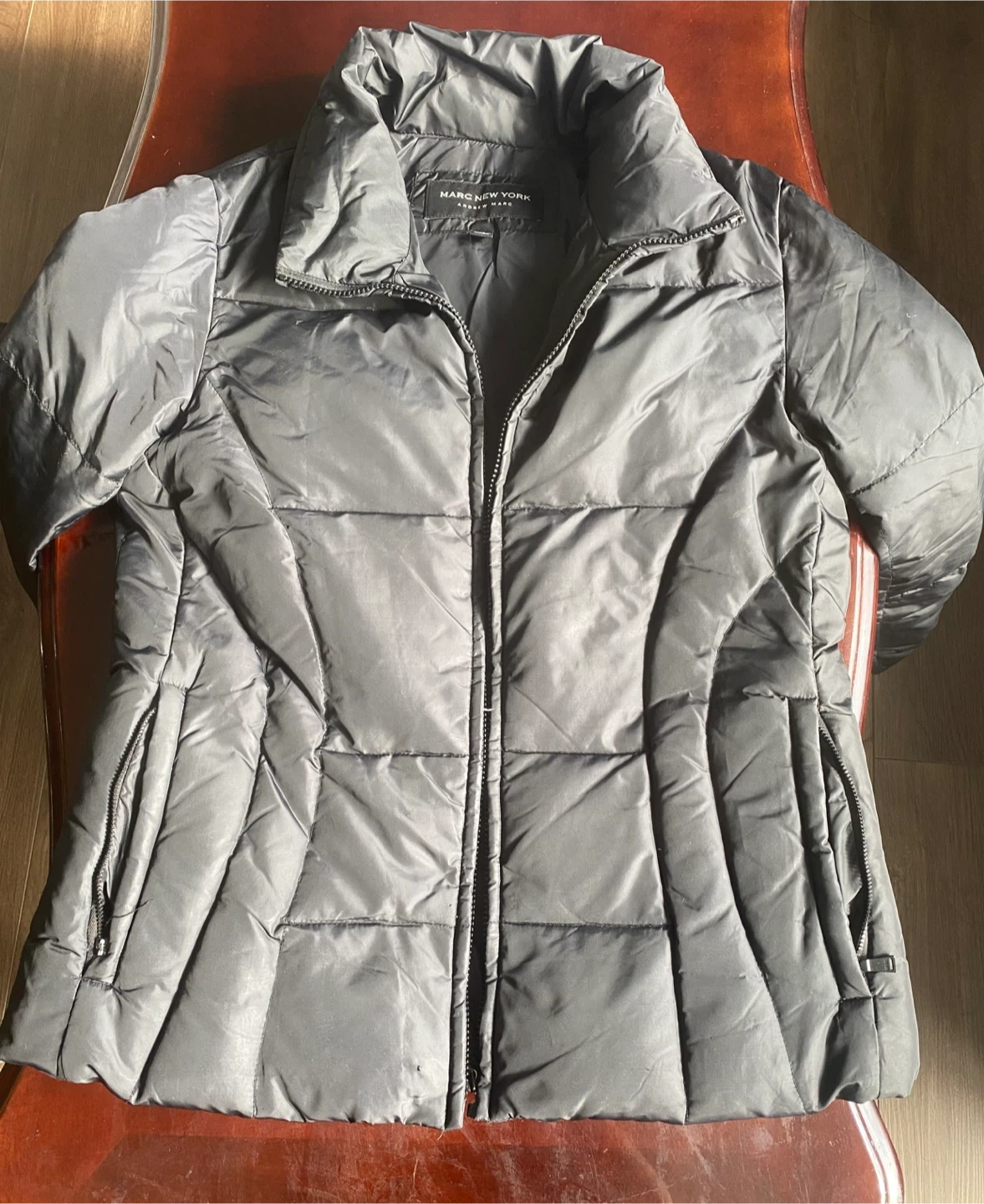 Here's a Marc New York Andrew Marc puffer jacket in size medium. It's a stylish and warm jacket perfect for chilly weather. The jacket is in great condition and ready for a new home!