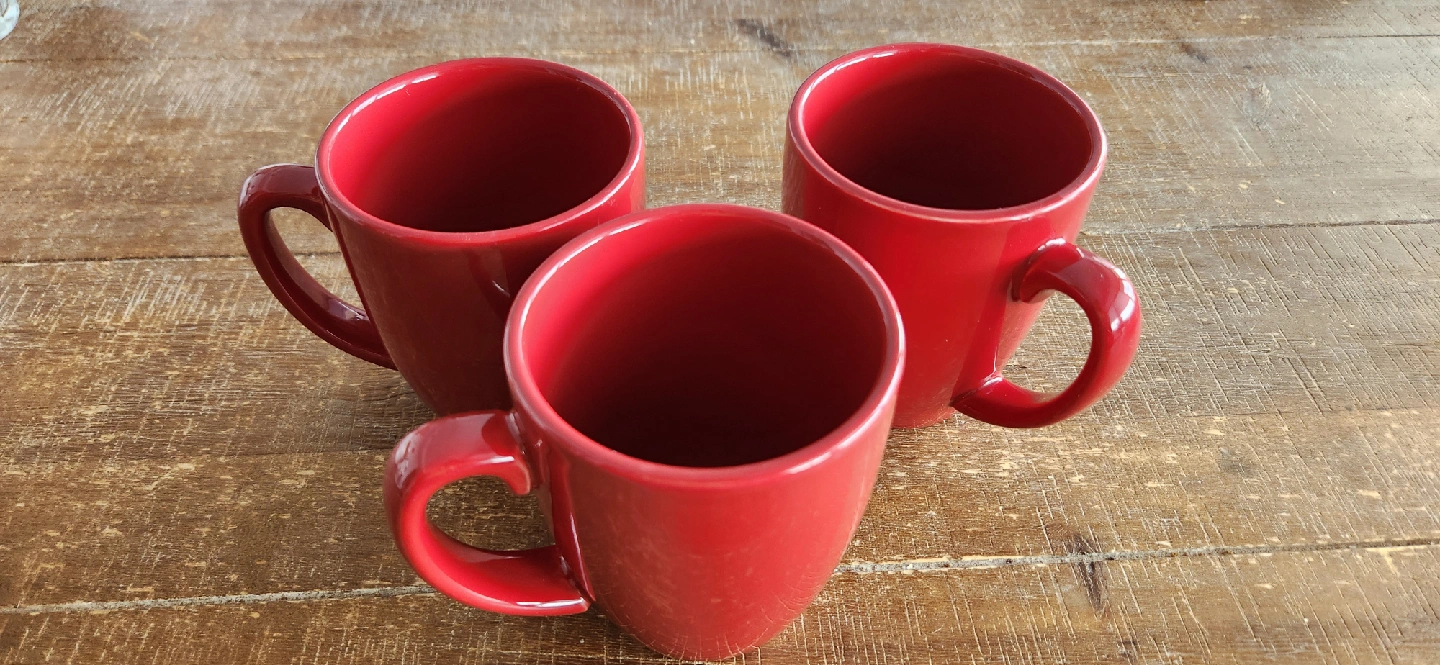 I'm selling a set of three red corelle ceramic mugs. They're in great condition and ready for a new home! Perfect for coffee, tea, or any beverage you fancy
