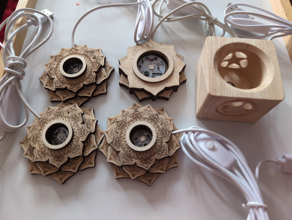 Selling my collection of a set of 4 wooden mandala string lights plus one square multi coloured/changing USB light plus 2 warm white box style.