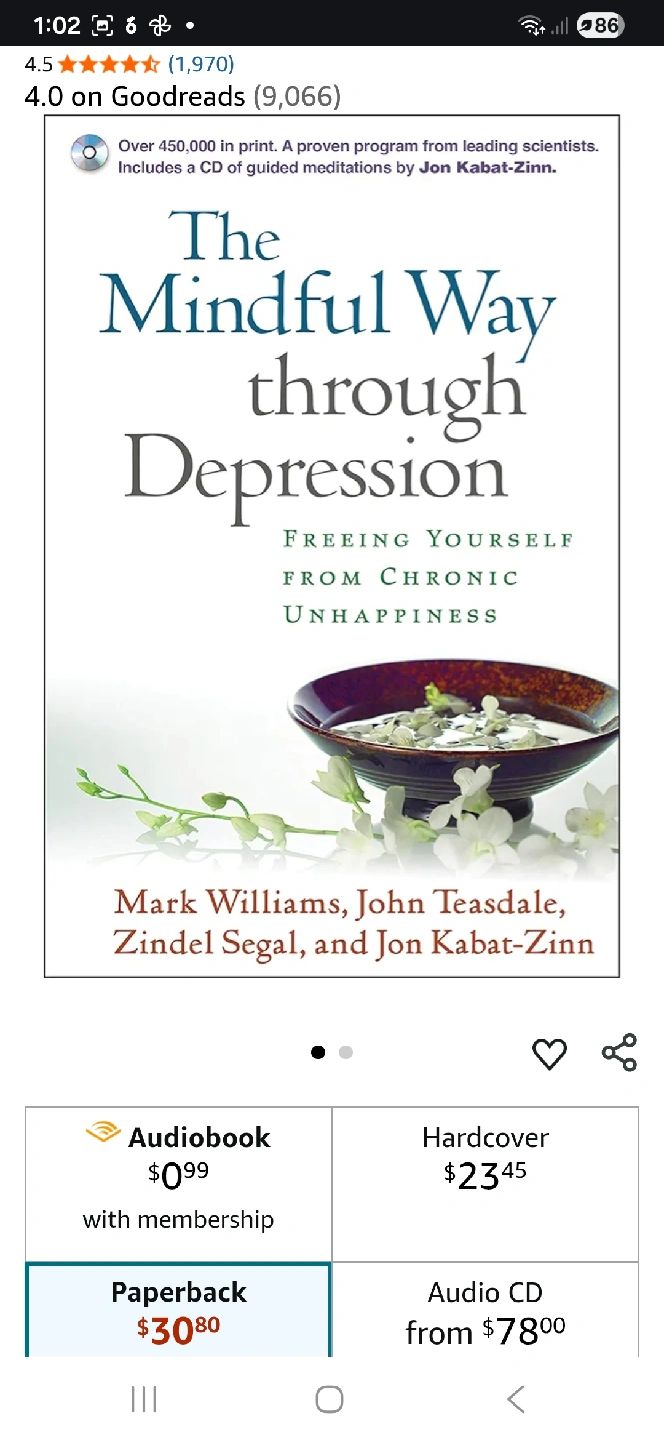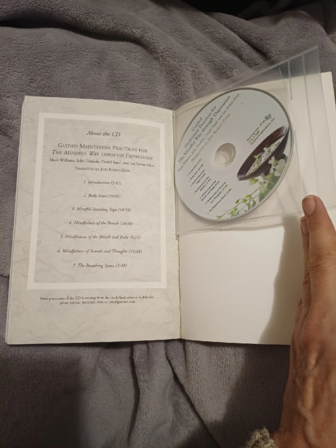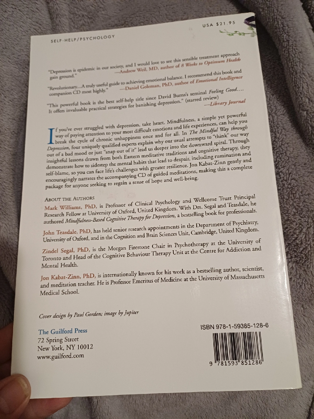 1000+"The Mindful Way through Depression" by Mark Williams, John Teasdale, Zindel Segal, and Jon Kabat-Zinn. This book helps free yourself from chronic unhappiness. It includes a CD of guided meditations by Jon Kabat-Zinn