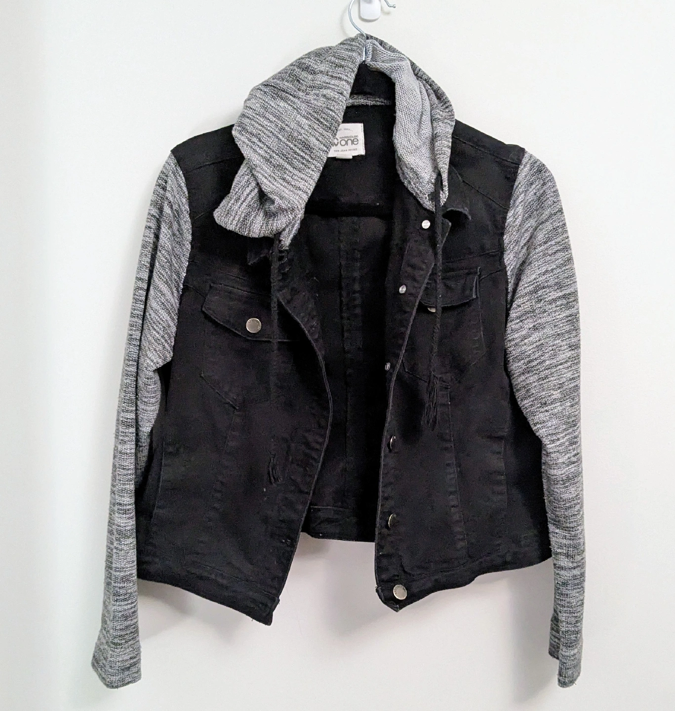 This is an Warehouse One denim jacket in black with grey sleeves and a hood. It's in great condition and ready for a new home!