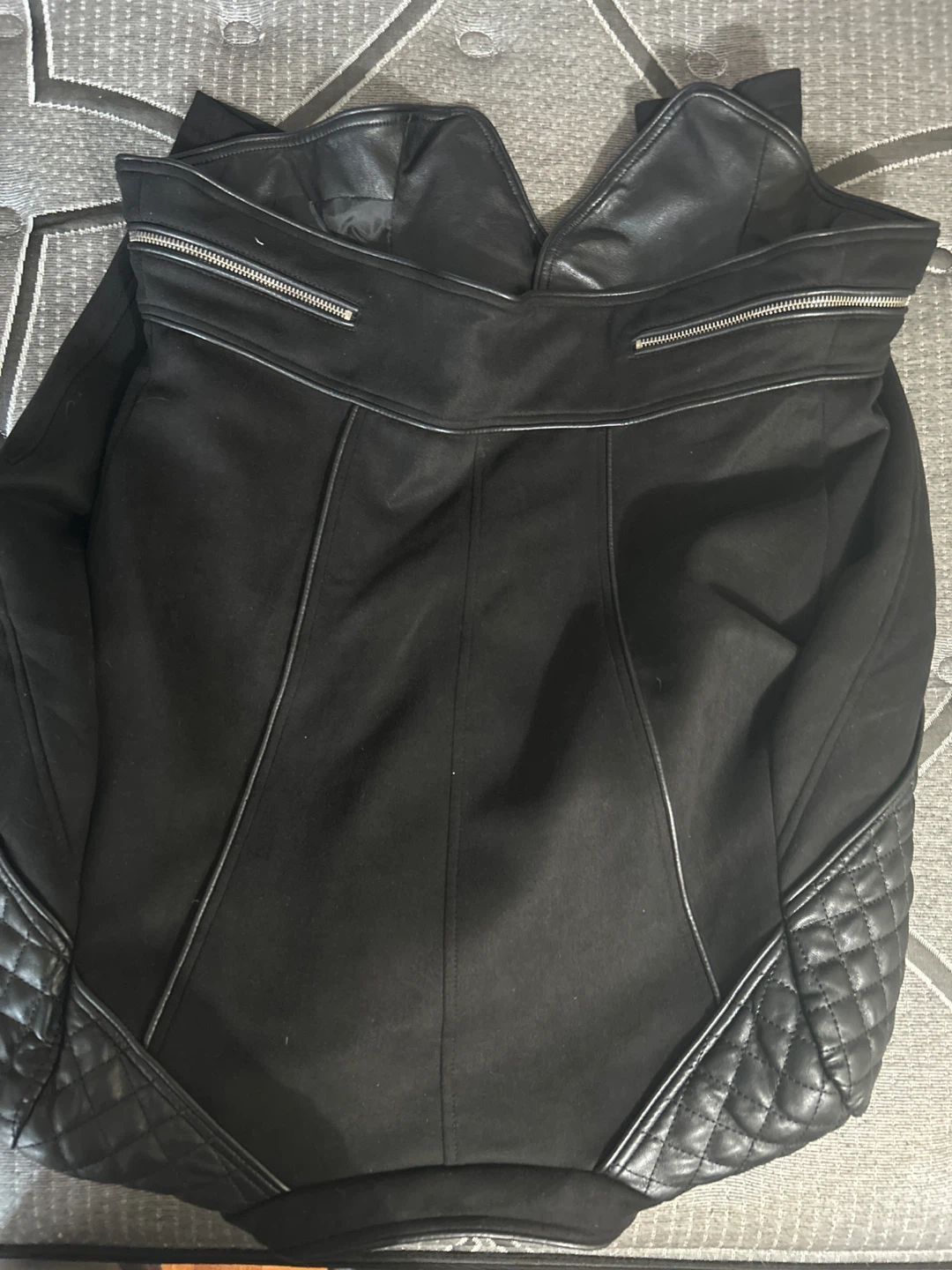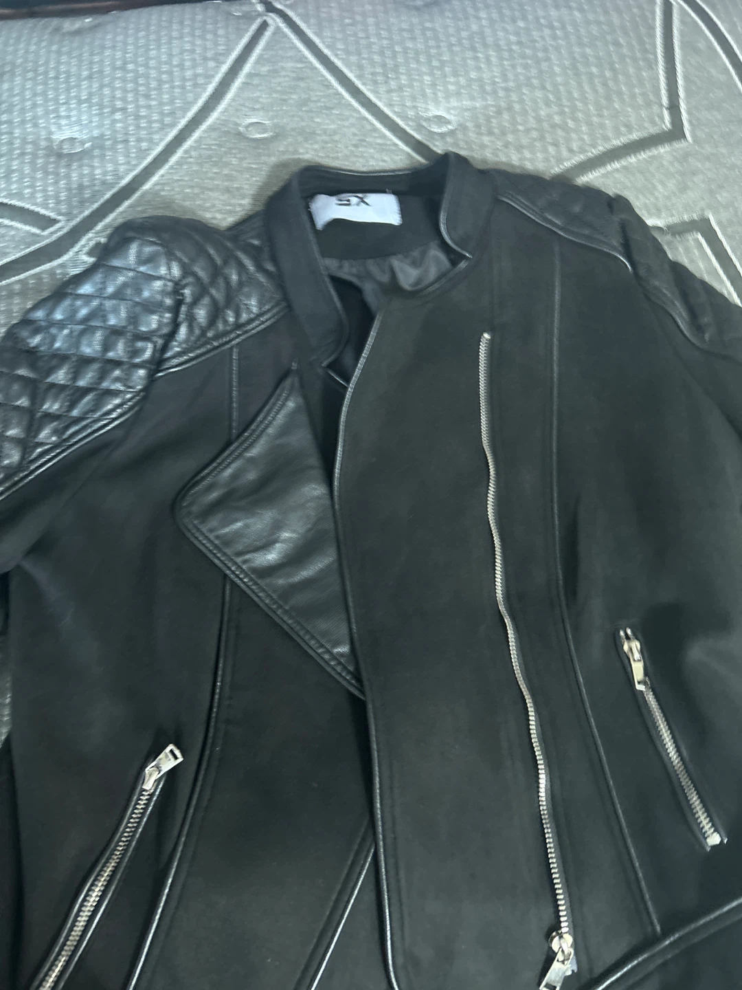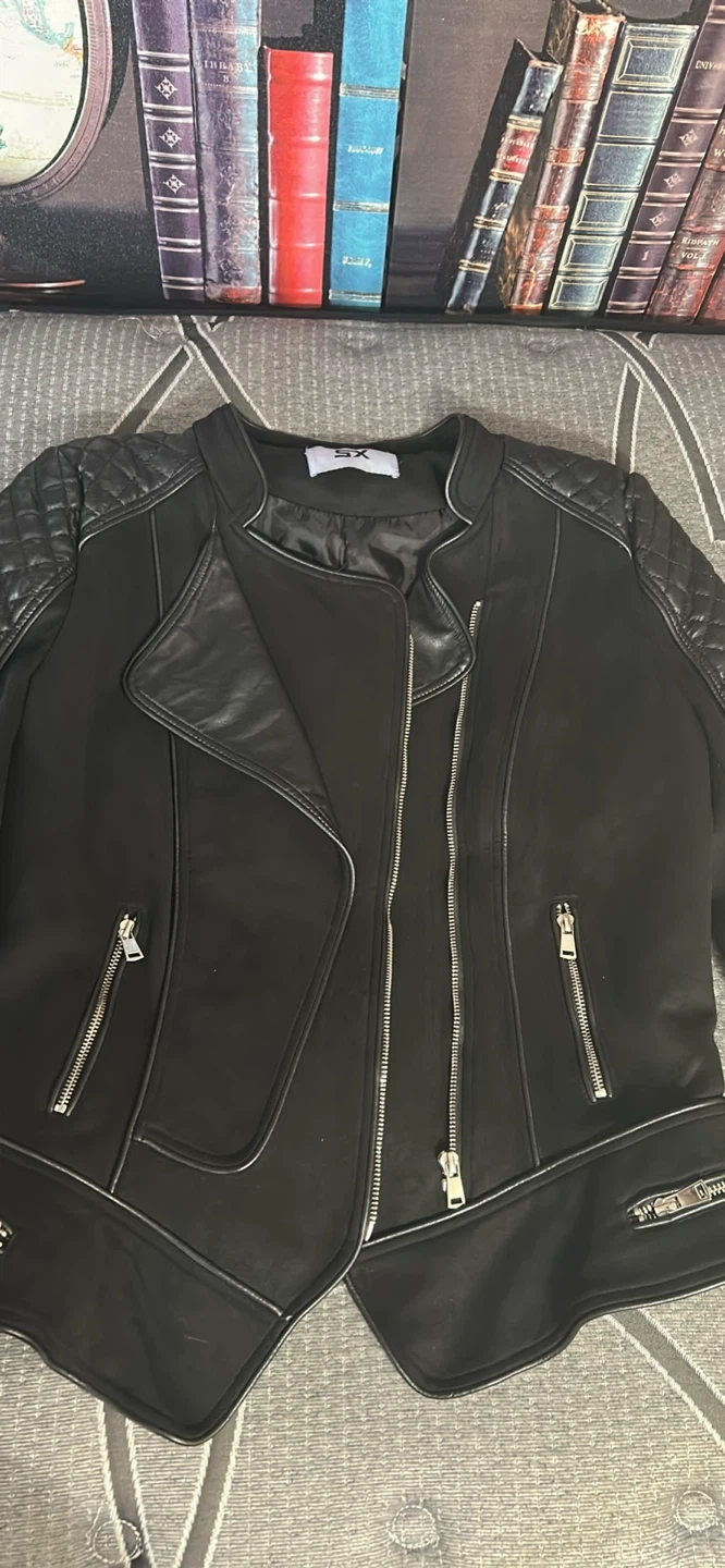 Here's a stylish black leather jacket from L It's a size L and features a unique asymmetrical design with quilted detailing on the shoulders. Perfect for adding a bit of edge to your wardrobe!