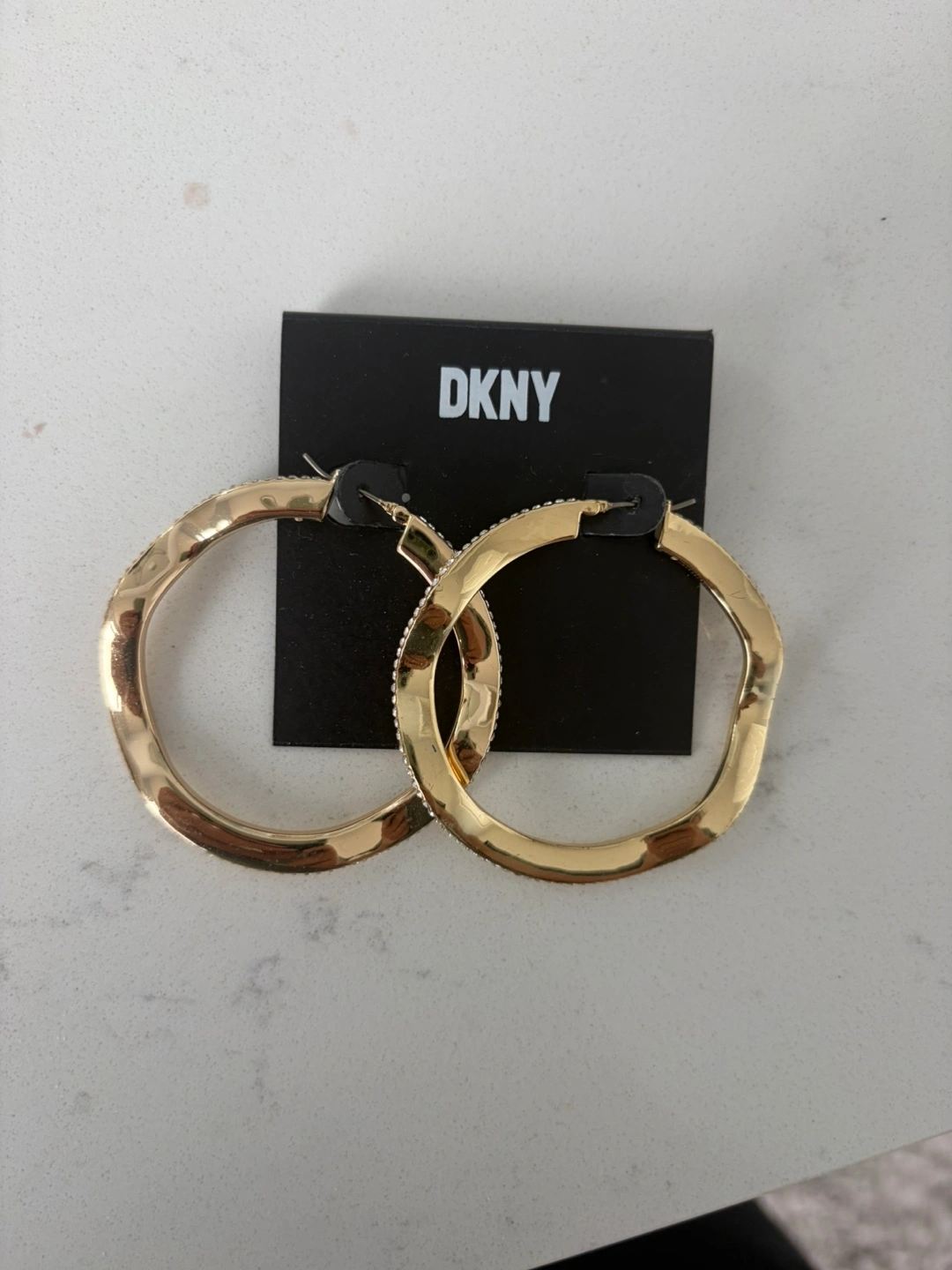 These DKNY gold hoop earrings are brand new and still have their tags on! They're a stylish accessory to elevate any outfit. The hoops have a unique, slightly irregular shape that adds a touch of modern flair.
