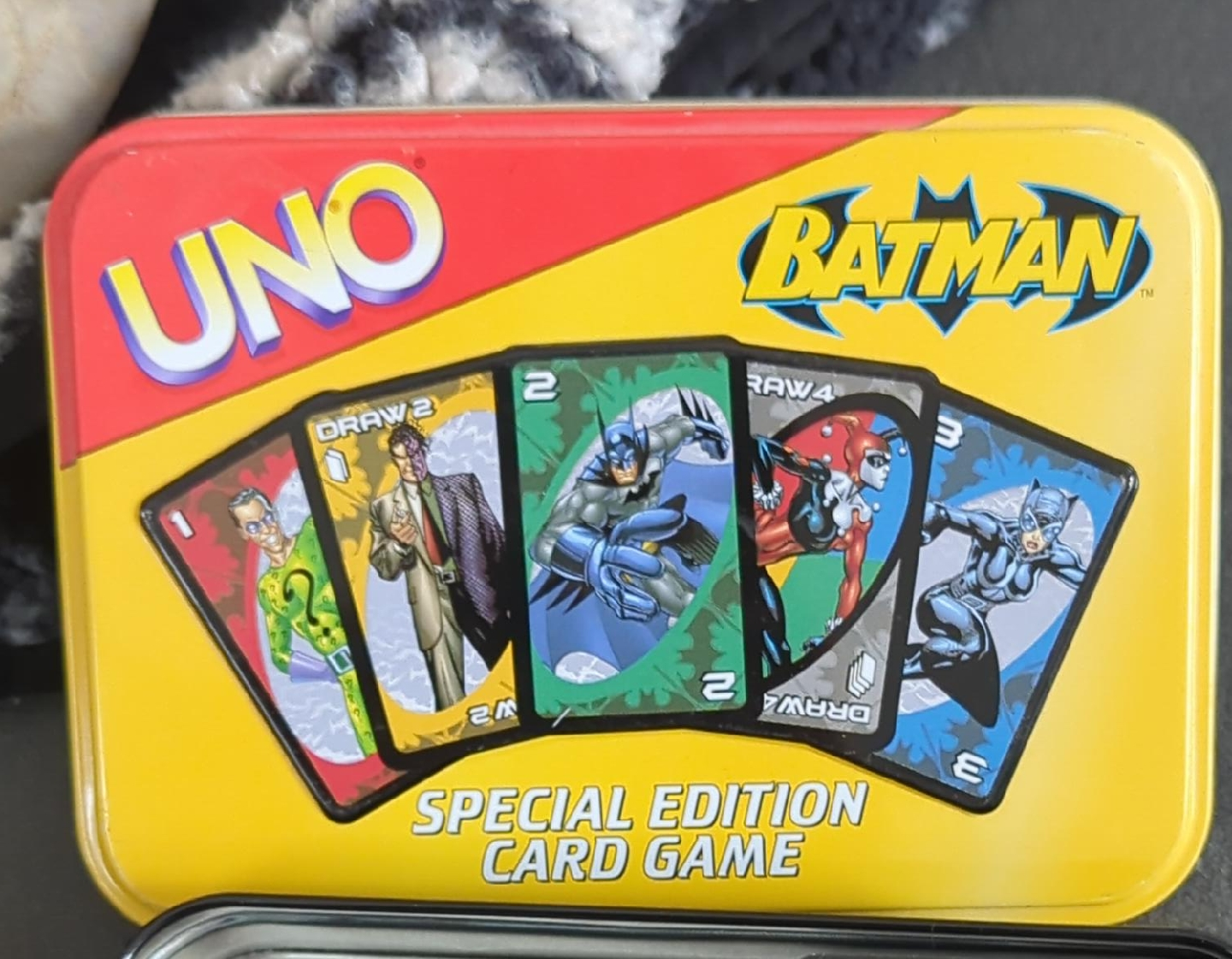 Selling a Batman UNO Special Edition card game! It comes in a collectible tin, perfect for any Batman or card game fan. This edition includes special Joker cards to add a twist to the classic UNO game. Get ready to use your stealth and speed to be the first to get 500 points to win the game!