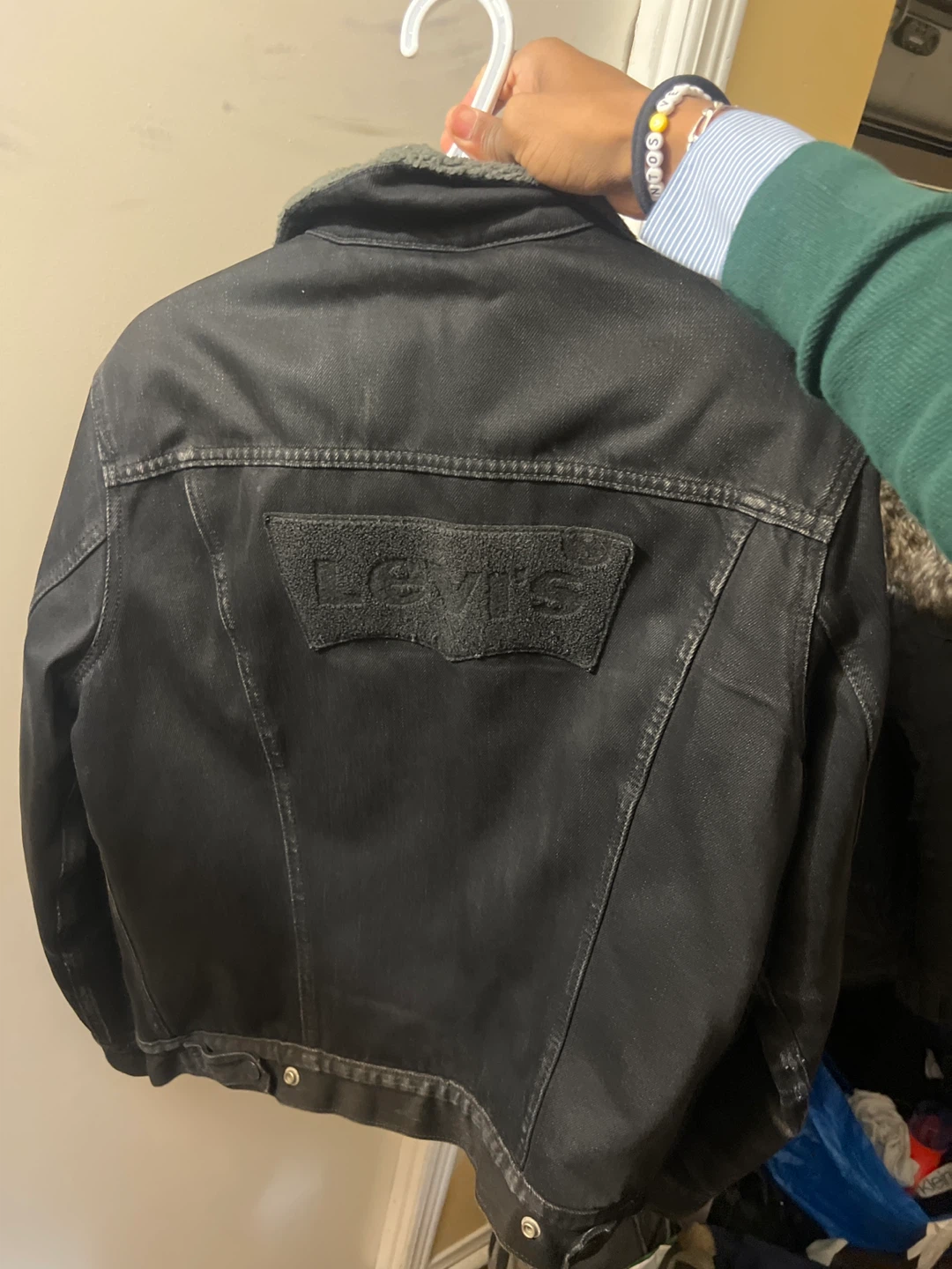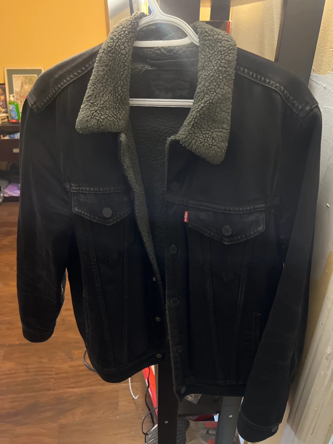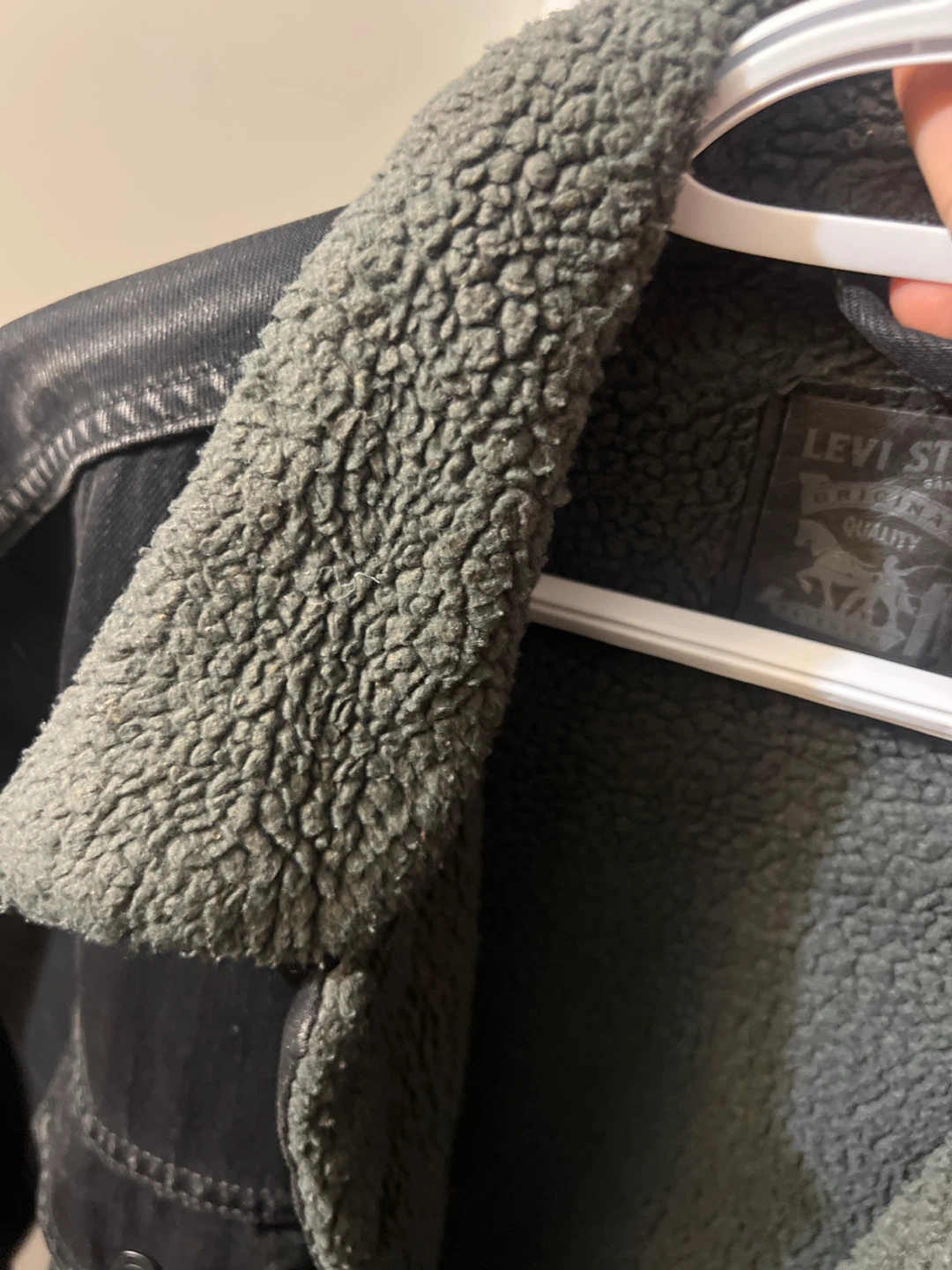 Classic Levi’s trucker with that warm, cozy sherpa lining,perfect for fall and winter. The faded black denim gives it that broken-in look while the inside keeps you surprisingly warm.