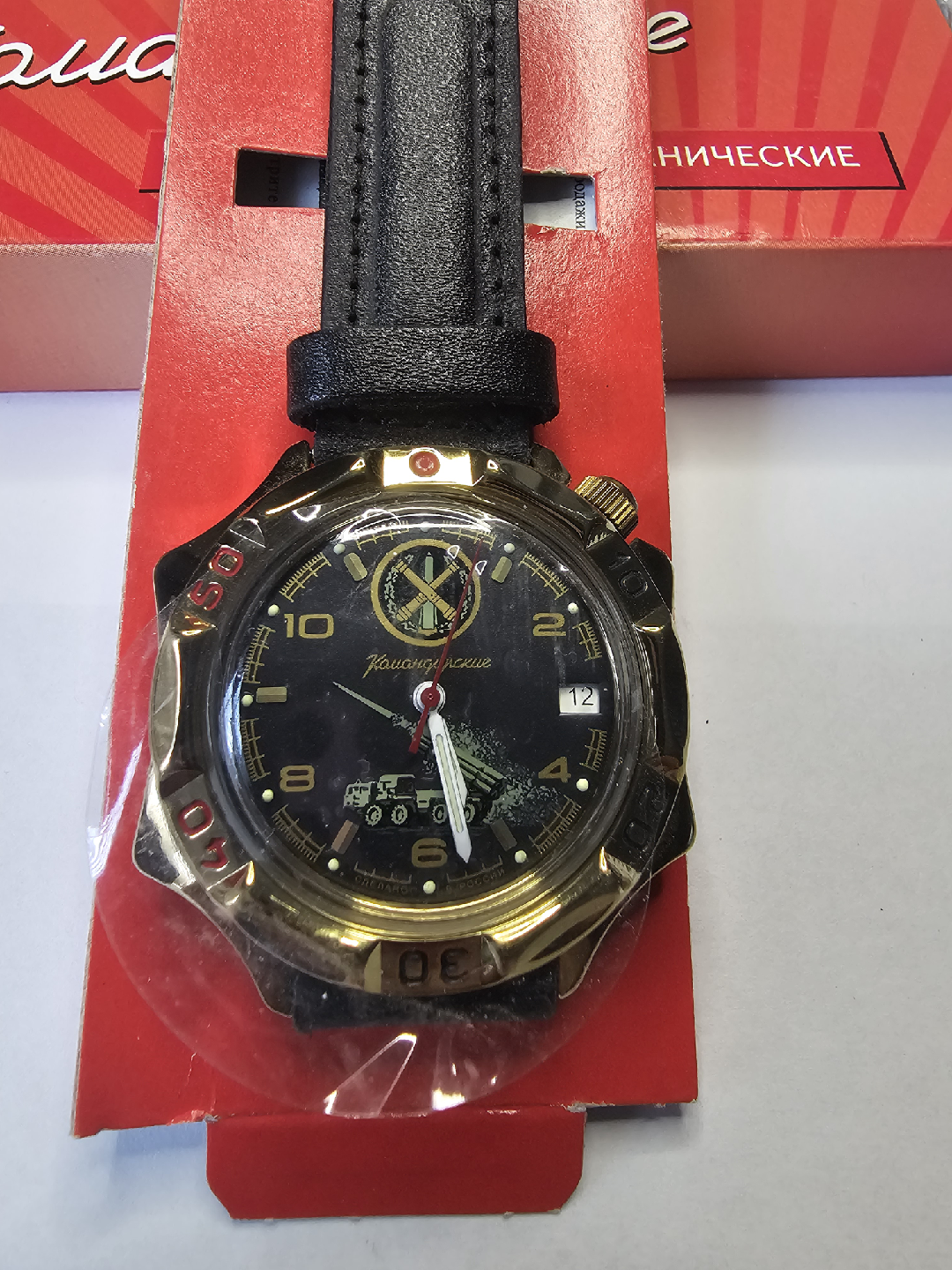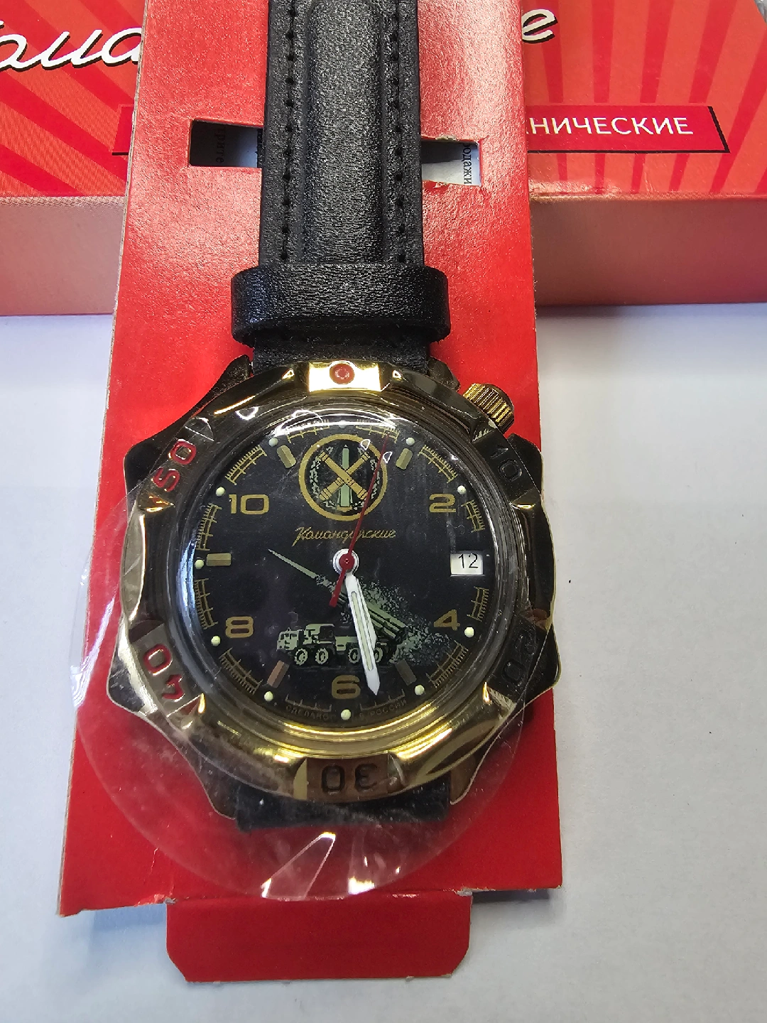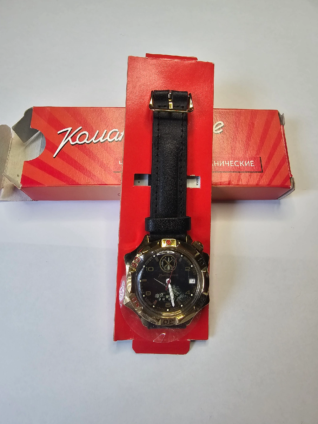 Selling a Komandirskie watch. It features a black dial with gold accents and a black leather strap. The watch is in its original packaging. never used, original stickers.