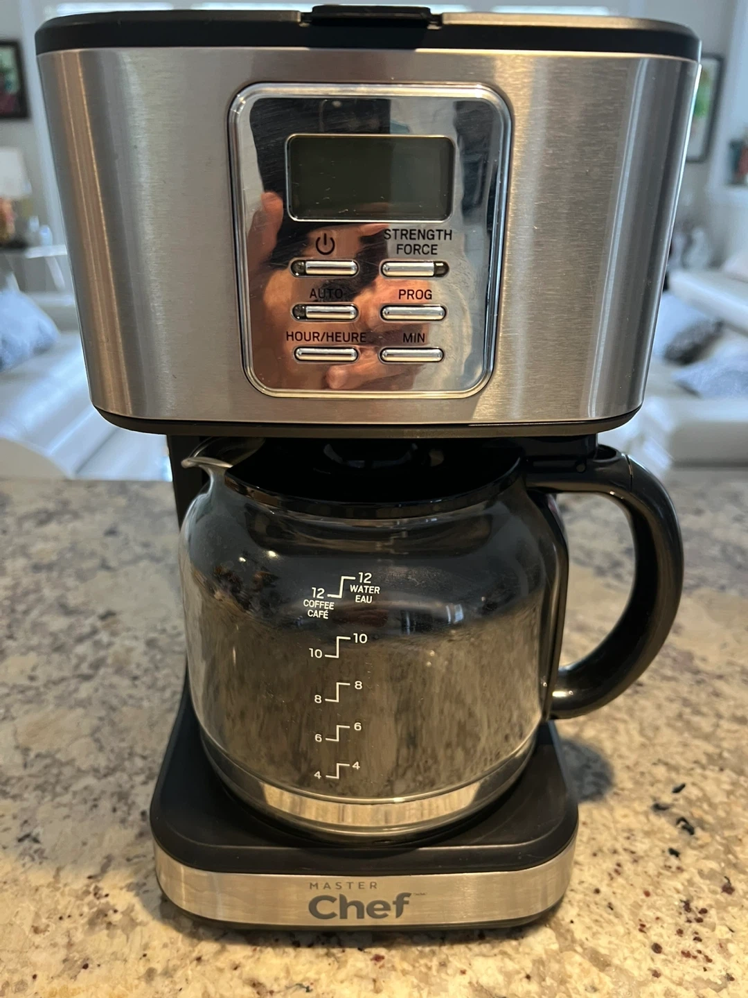 Selling a Master Chef coffee maker! It can brew up to 12 cups. It has settings for strength, auto, and program, and also has a timer.