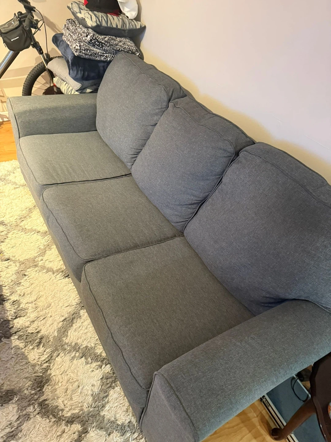 Selling a comfy grey 3-seat sofa! It's in great shape and ready for a new home. Perfect for a living room or den. The cushions are nice and plush, making it a great spot to relax after a long day.