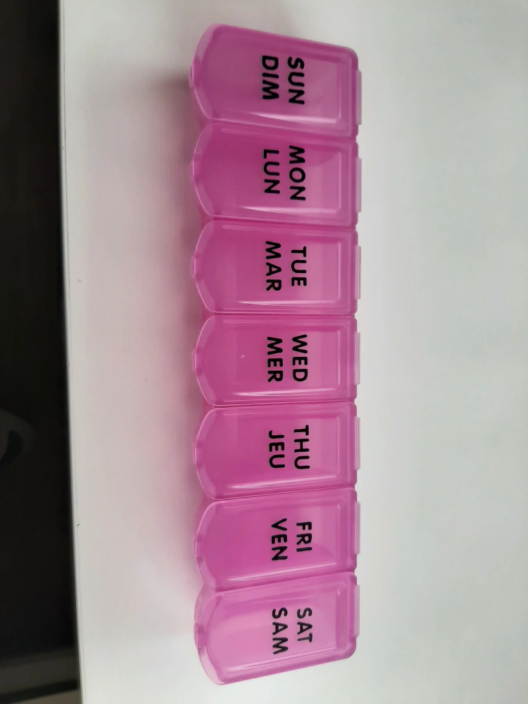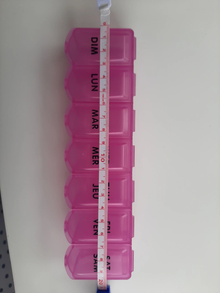 Selling a pink pill organizer with compartments for each day of the week. It measures approximately 20cm in length, 5cm in width, and 3cm in height. Perfect for keeping your medications organized!