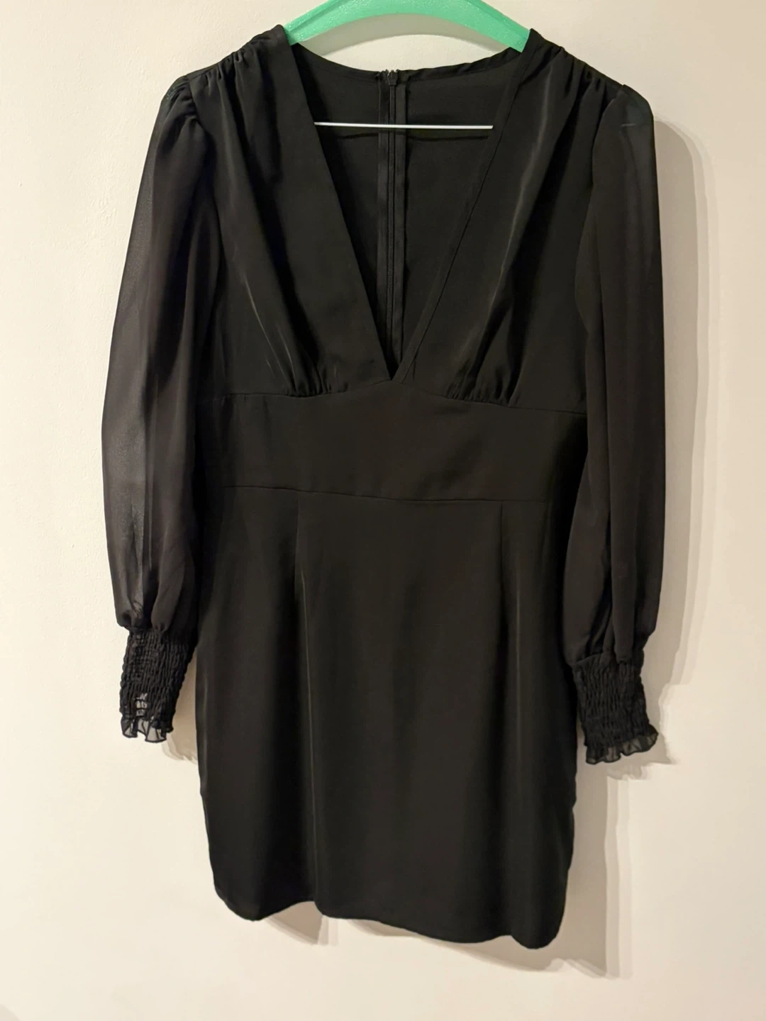 121Selling a stylish black mini dress. The dress features long sleeves and a flattering V-neckline