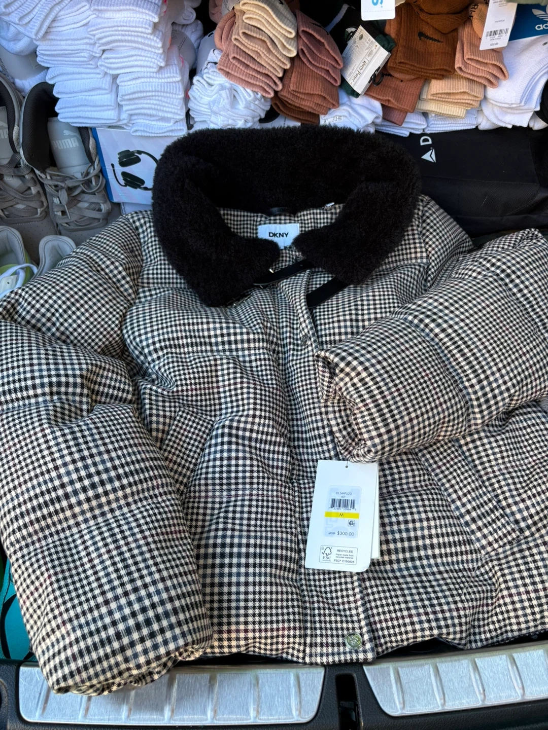 Stylish DKNY puffer jacket in a plaid pattern with a faux fur collar! It's a size small and would be a great addition to your wardrobe for the colder months. The jacket is in excellent condition and ready for a new home. The original price was $220