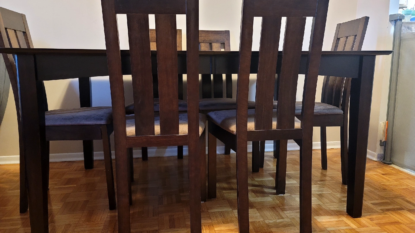 Selling a dark wood dining table with six matching chairs. It's in good shape and ready to be the centrepiece of your dining room. The chairs have comfortable, upholstered seats.