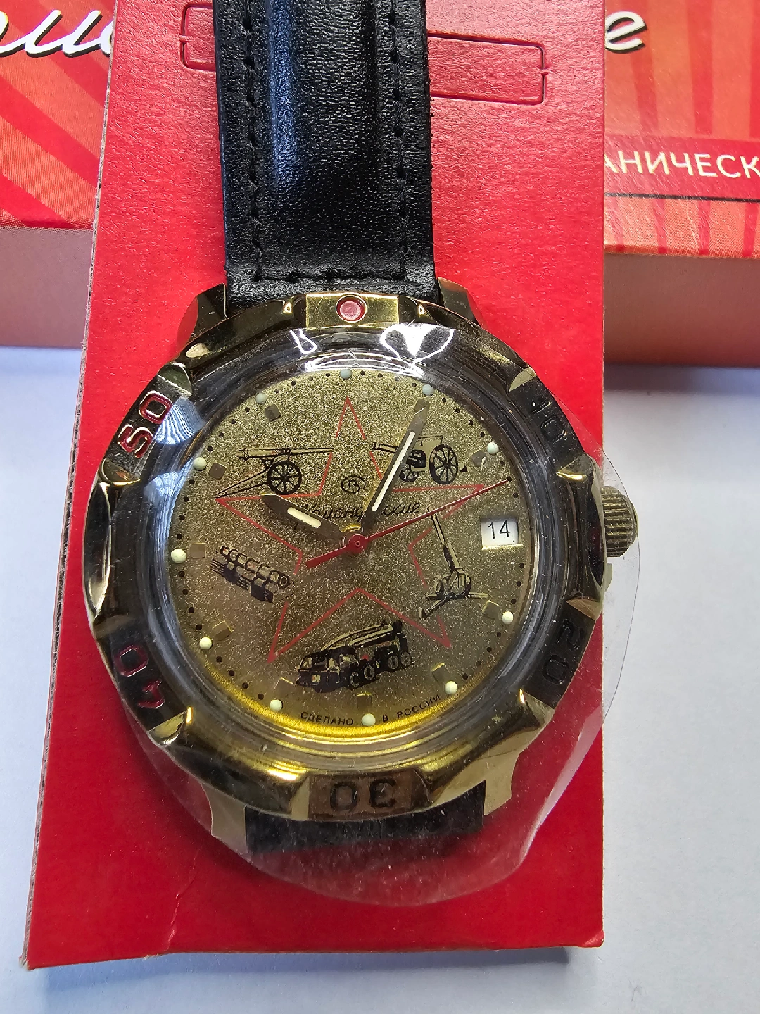 Selling a vintage Komandirskie mechanical watch. It comes with the original box! The watch has a black leather strap and a gold-tone case. It's a unique piece with military-themed designs on the dial