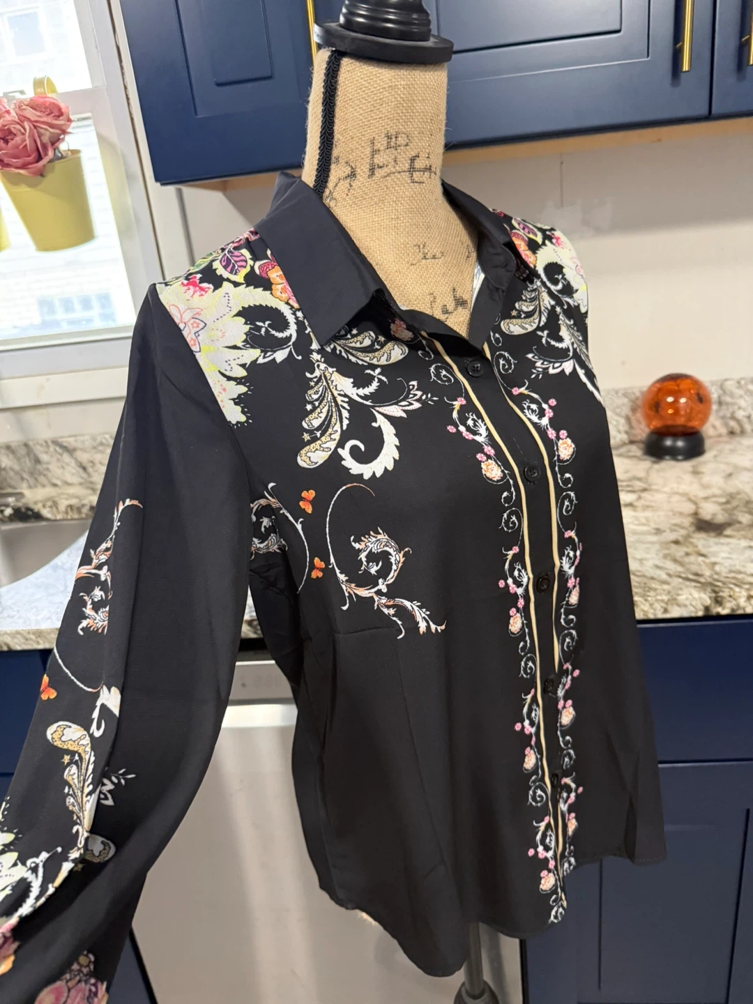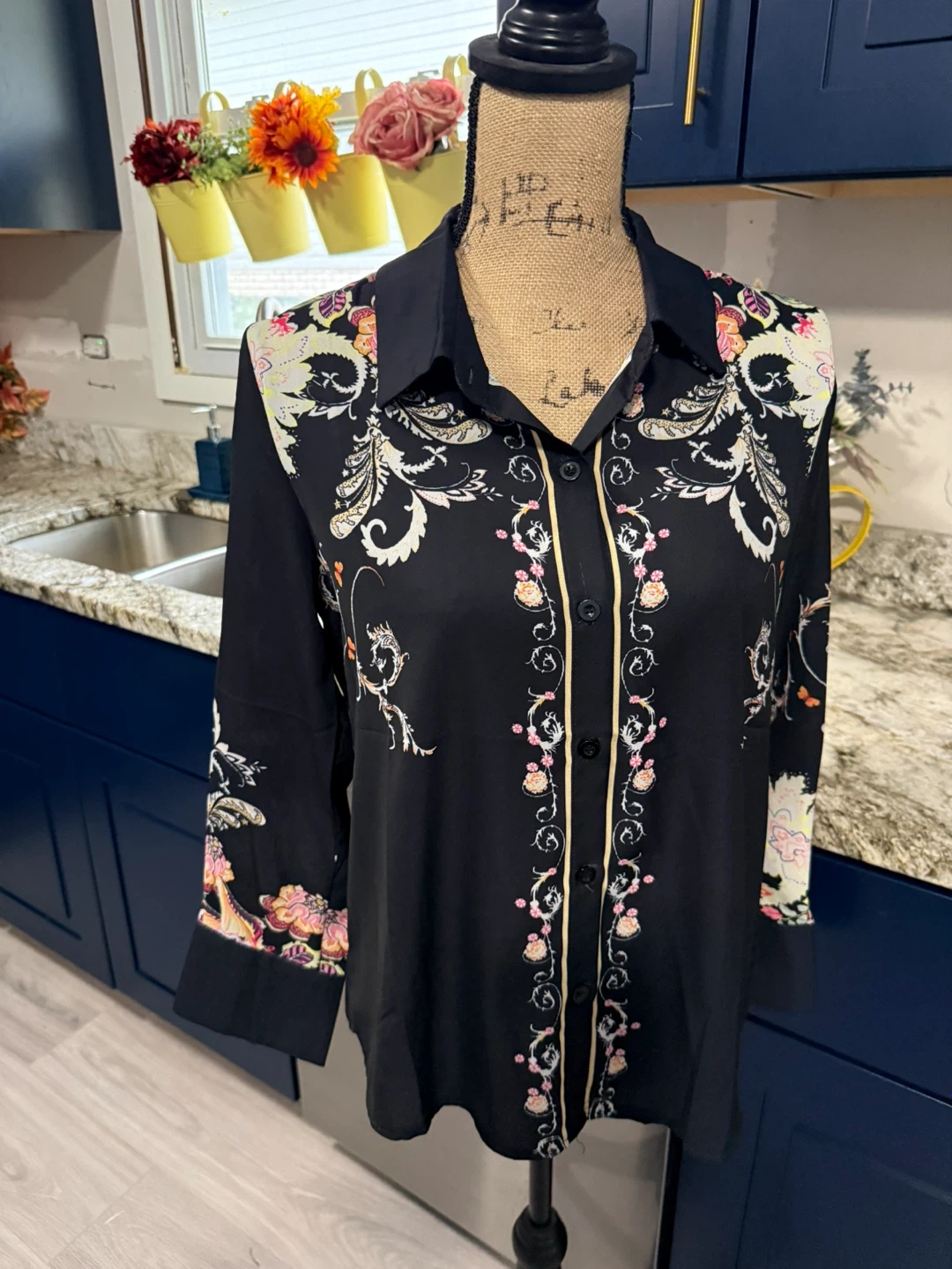 Like new ues 2 time perfect condition clean Here's a stylish button-down shirt with a beautiful floral print! It's black with colorful floral designs on the sleeves and front. Perfect for adding a touch of elegance to any outfit