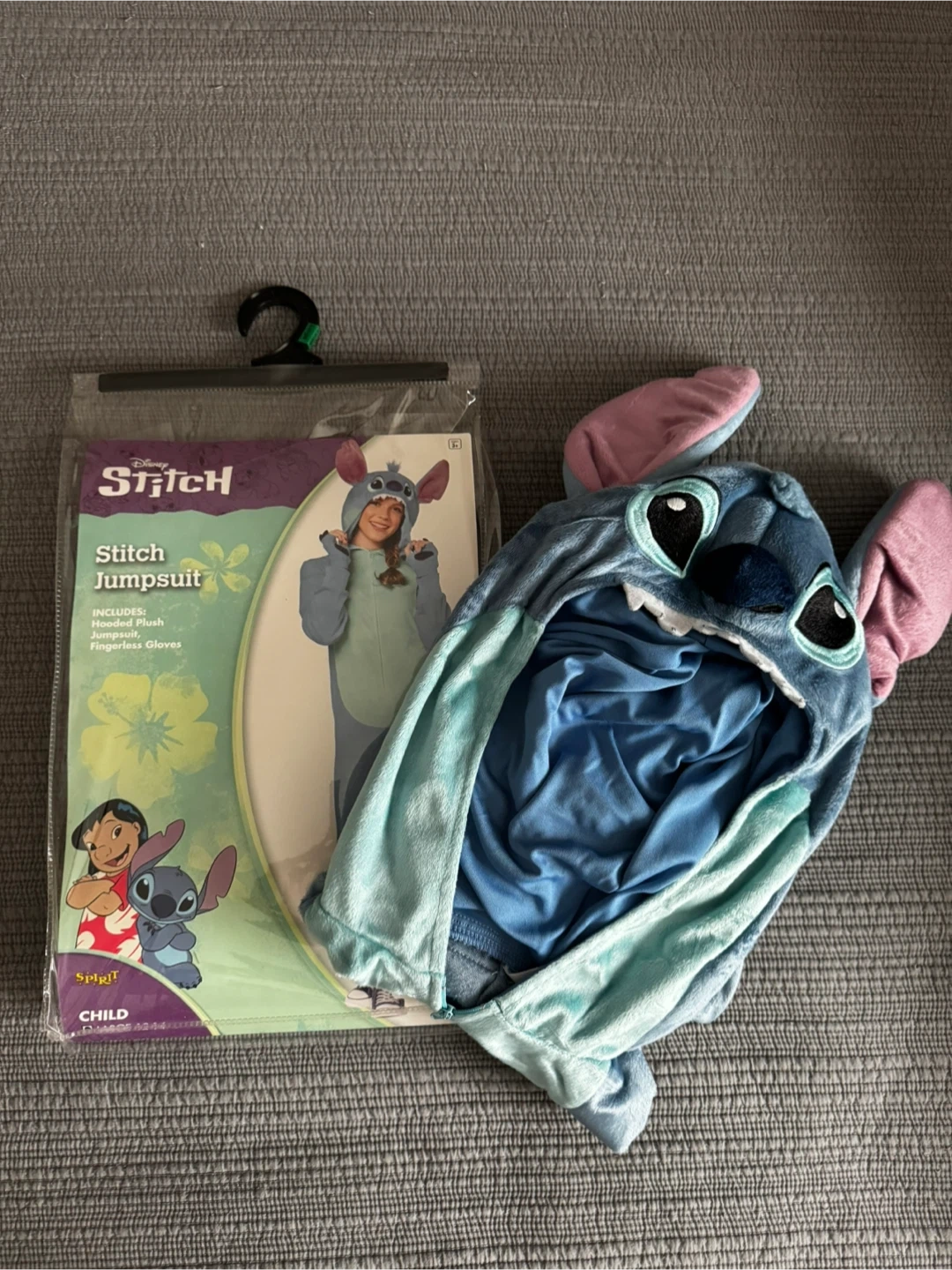 Selling a Disney Stitch jumpsuit for kids! It's a child's large (size 12-14). The jumpsuit is hooded and plush. It's still in the original packaging!