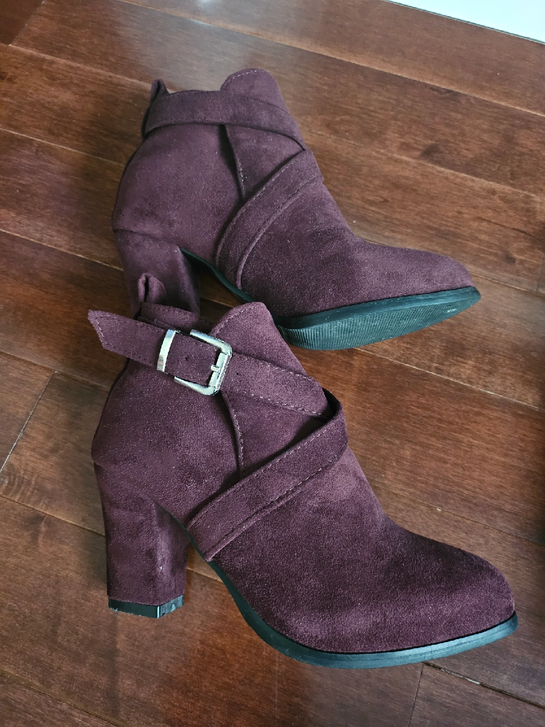 Stylish burgundy ankle boots with a heel! These boots feature a strap and buckle detail. They're in good condition and ready for a new home