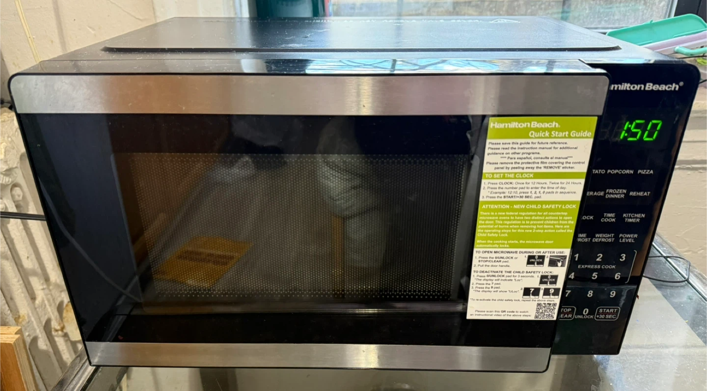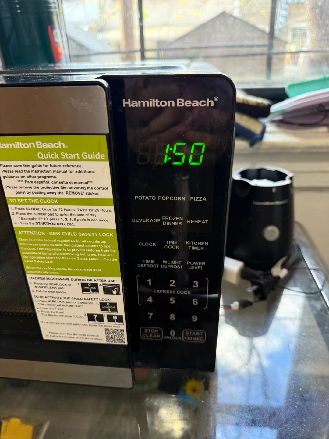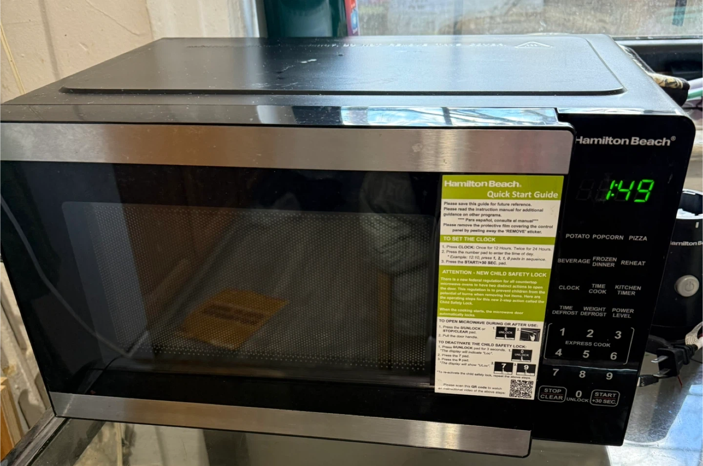 Hamilton Beach microwave oven in good condition. It has settings for potato, popcorn, pizza, beverage, frozen, and reheat. There's also a kitchen timer option. No box