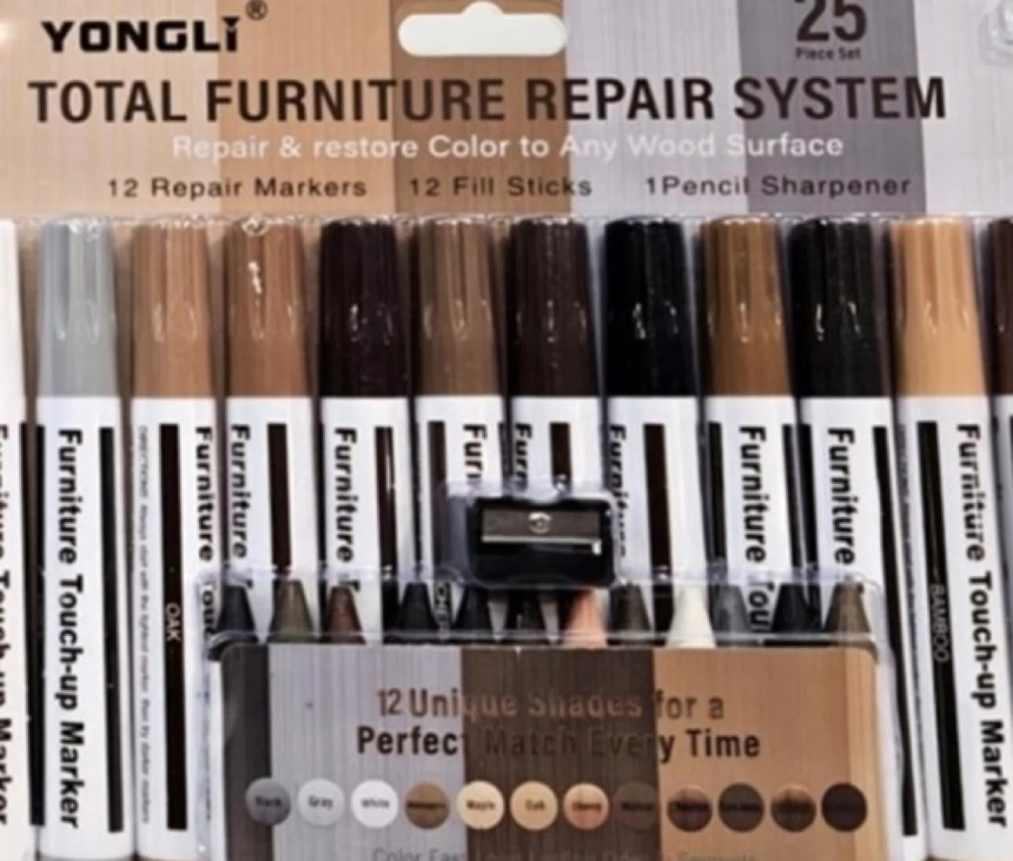 Get your furniture looking its best with this Yongli Total Furniture Repair System! This 25-piece set includes 12 repair markers, 12 fill sticks, and a pencil sharpener to help you repair and restore colour to any wood surface. It has 12 unique shades for a perfect match every time