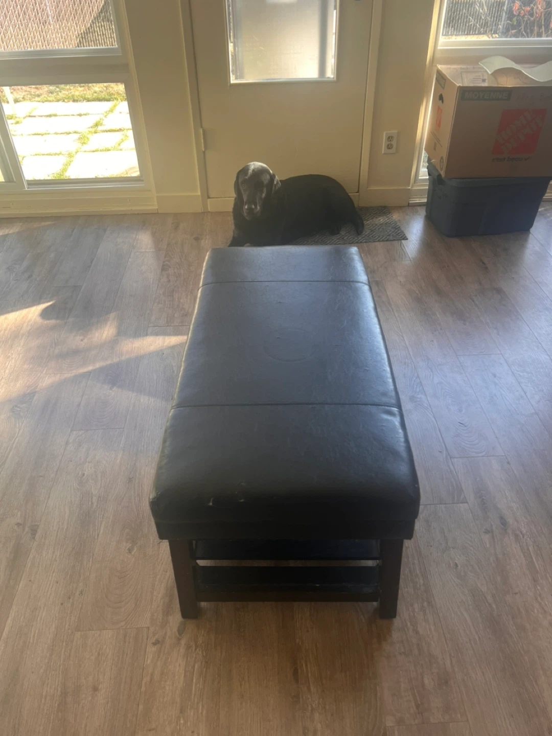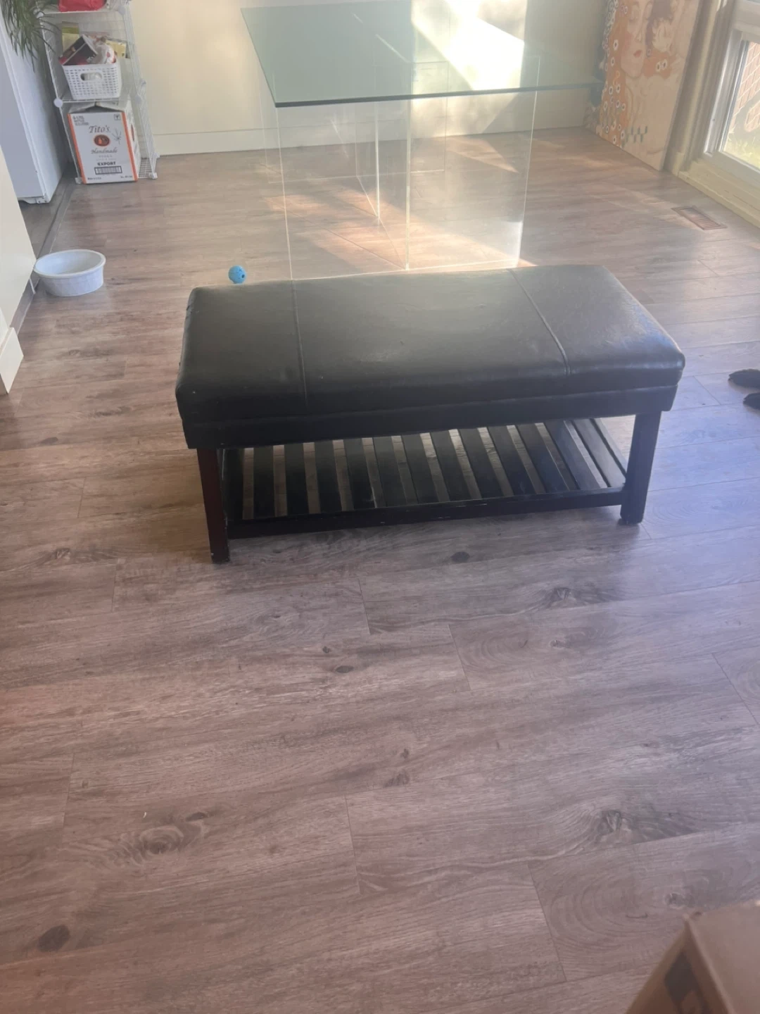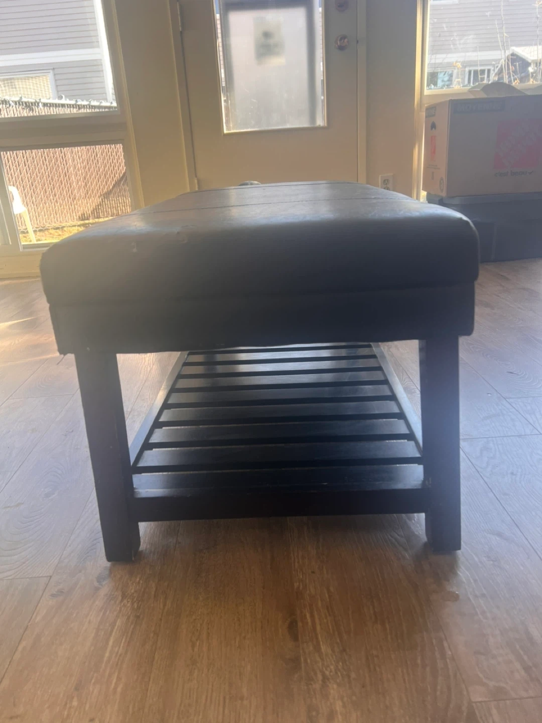 Selling a black ottoman bench. It's in good condition and features a storage shelf underneath the cushioned top. Perfect for extra seating or as a coffee table with storage!