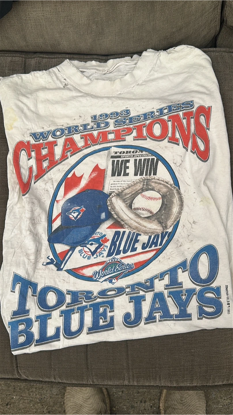 Selling a vintage Toronto Blue Jays 1993 World Series Champions T-shirt! It has a cool graphic with the Blue Jays logo and a newspaper headline that says "We Win". It's a piece of Toronto sports history!