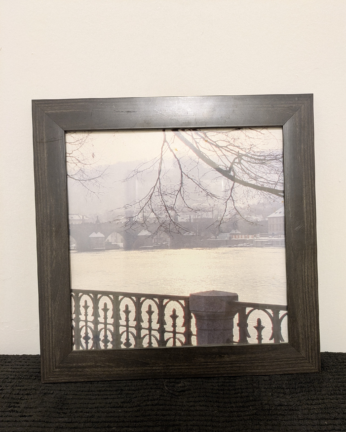 FS; framed picture of a cityscape across a body of water, featuring a wrought iron railing. Romantic, vintage aesthetic.