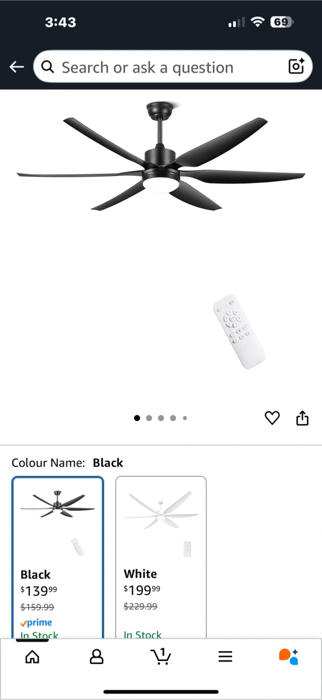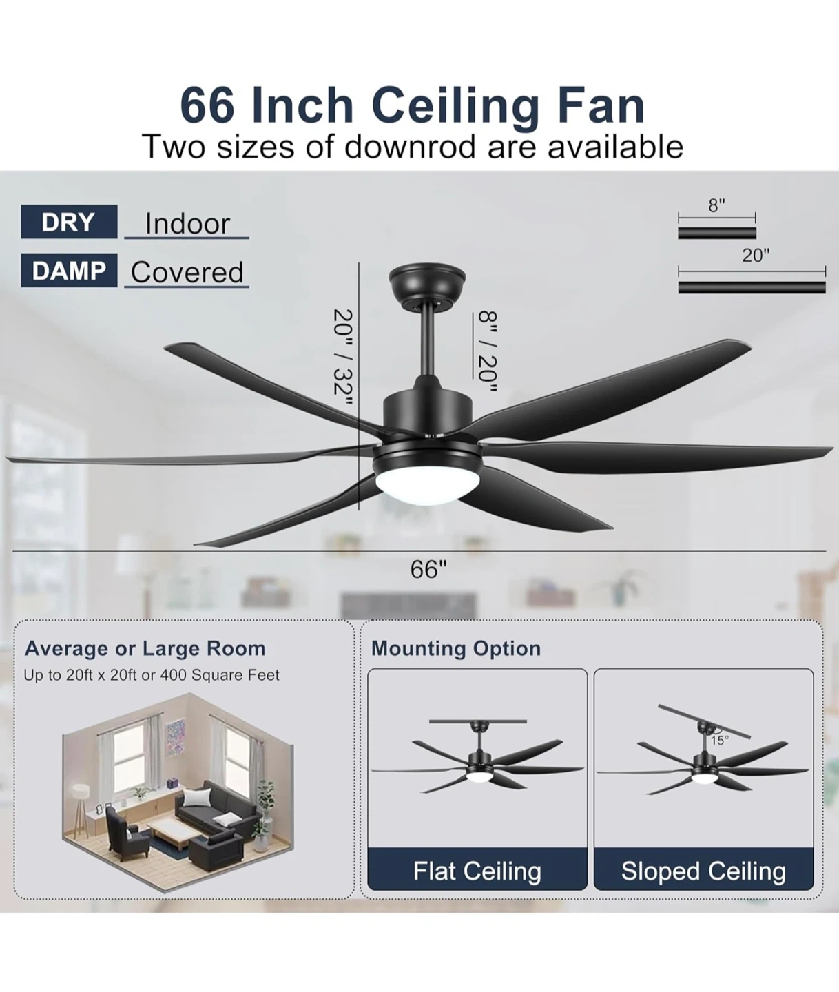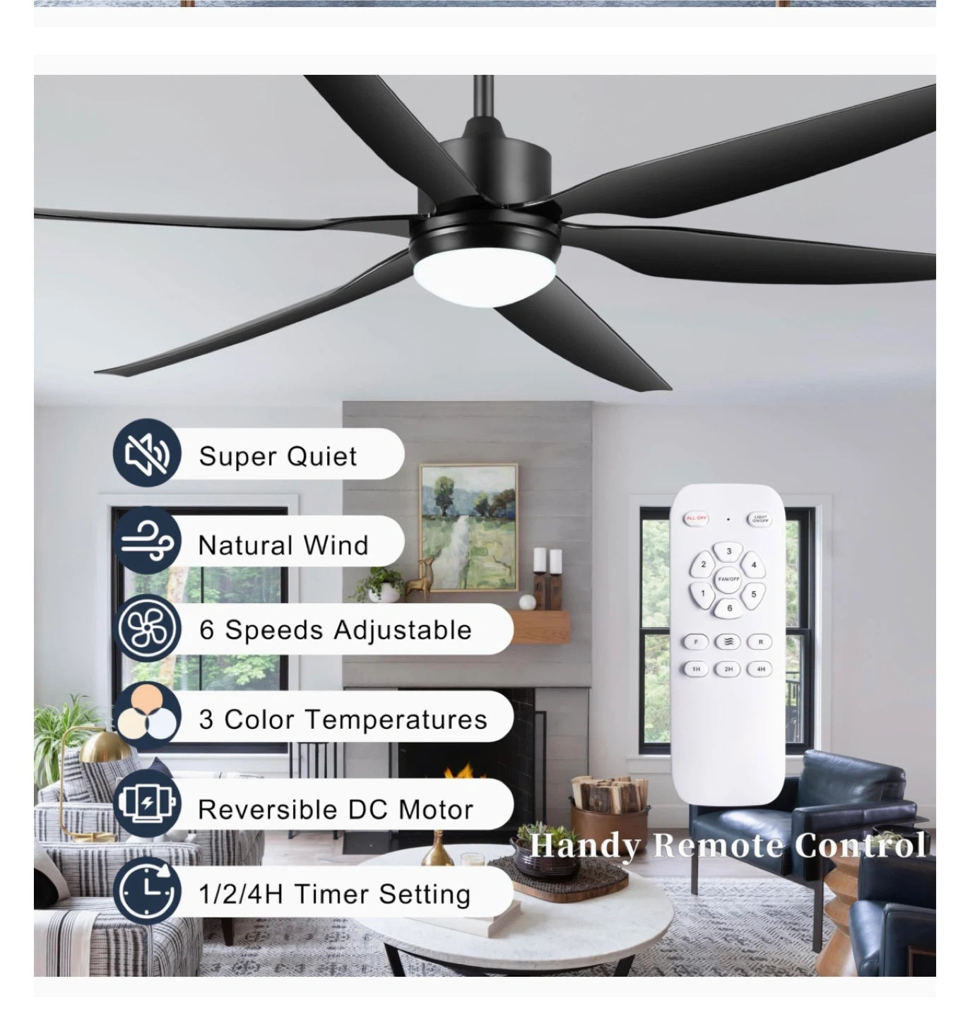 Selling a brand new Ohniyou 66" indoor,outdoor ceiling fan in black! It comes with lights and a remote control. This large ceiling fan has 6 blades and 6 speeds, and is reversible. Perfect for a patio, office, garage, or shop. It also has smart timing ceiling fan light features. Retails for $139.99!