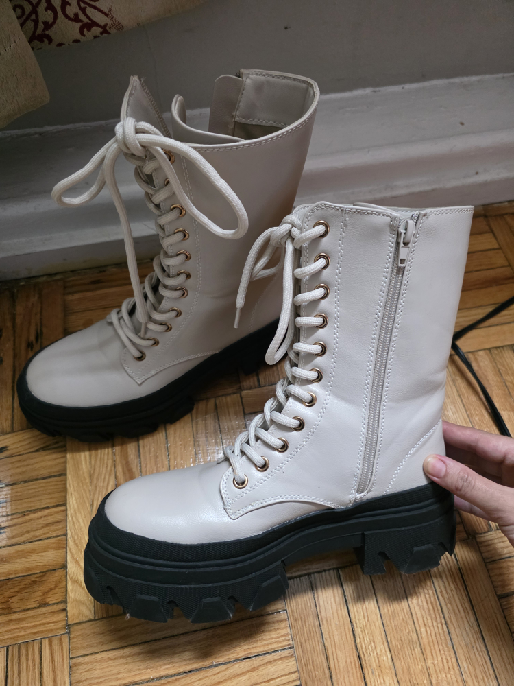 Selling a pair of stylish white lace-up platform boots! These boots feature a chunky black sole, adding a trendy touch to any outfit. Perfect for adding some edge to your wardrobe!
