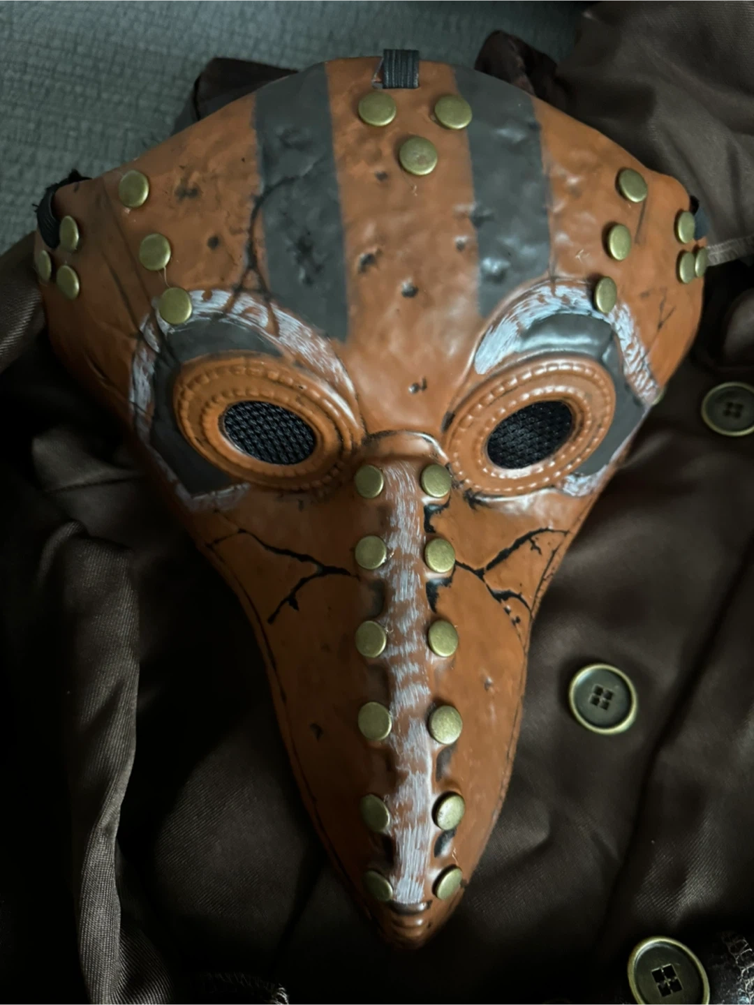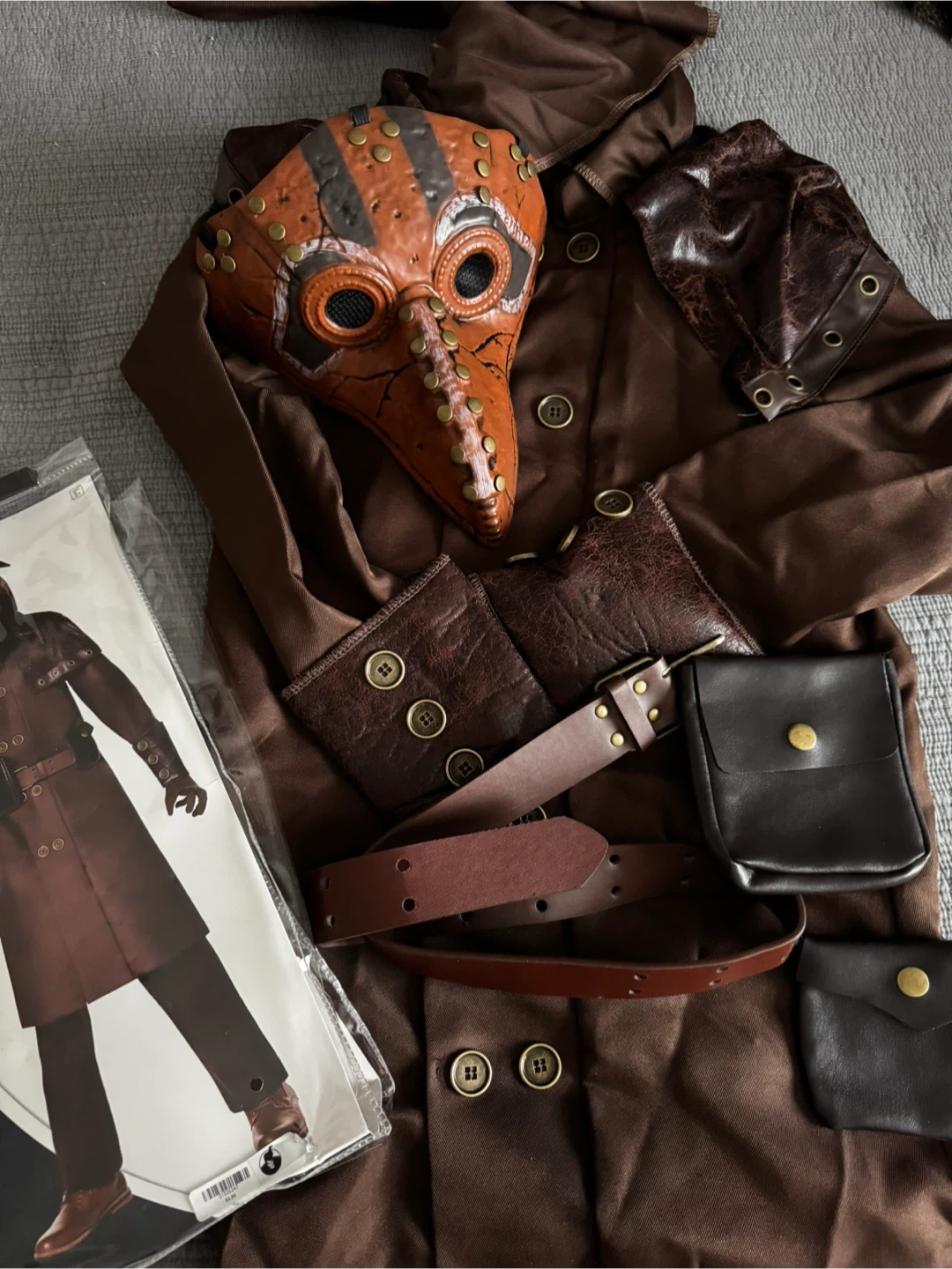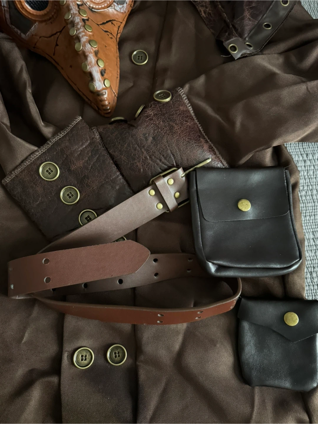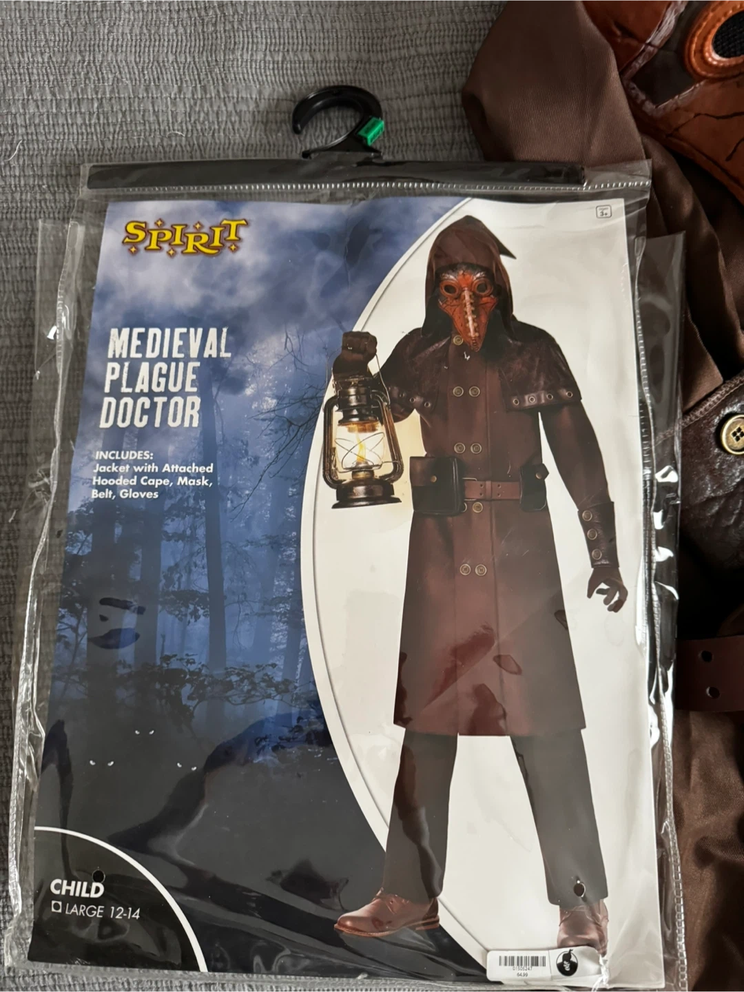 Selling a Spirit Halloween Medieval Plague Doctor costume for kids! This is a size Large (12-14). The costume includes the jacket with attached hooded cape, mask, belt, and gloves. Perfect for Halloween or dress-up!