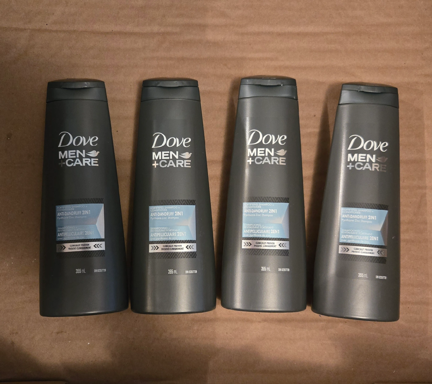 1000+Selling four bottles of Dove Men+Care Anti-Dandruff 2in1 shampoo and conditioner. Each bottle contains 355 mL. Clinically proven to help with dandruff!