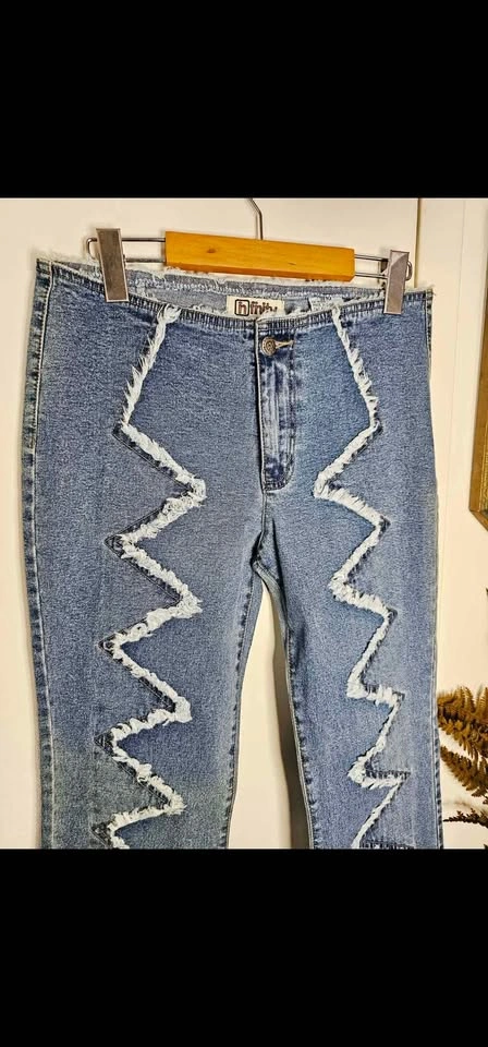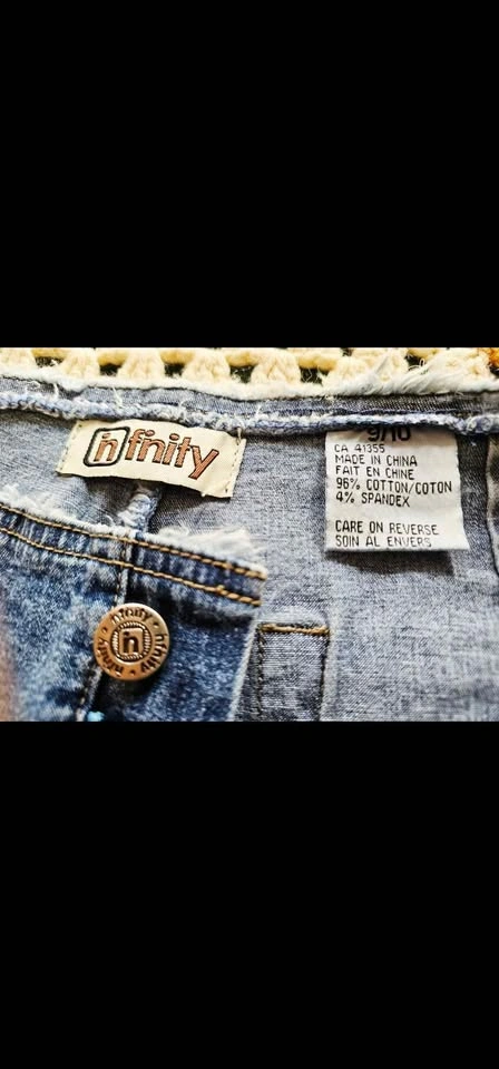 Jeans are a vintage size 9/10 and in very good used condition. Across the waistband/hips measures about 15.5", inseam measures about 31", and front rise measures about 9" - please check the measurements to be sure they will work for you. Made by the brand "infinity". Made of a stretchy blend of 96% cotton, 4% spandex.
