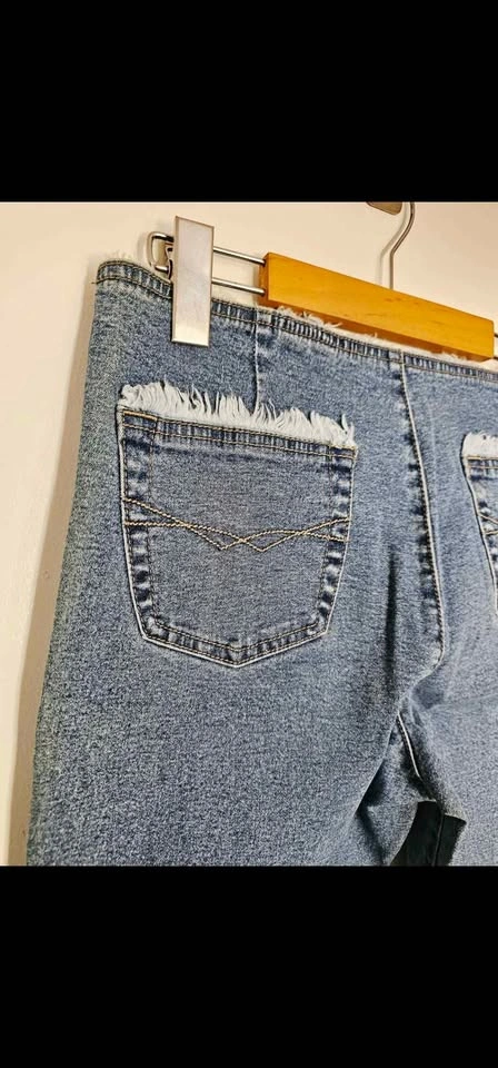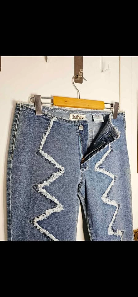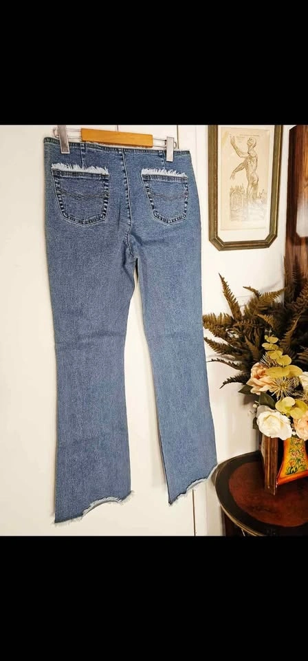 Vintage Y2K low rise flare stretch jeans in a medium blue wash, with a stitched zigzag frayed fringe raw hem seam down the front. Jeans have frayed fringe raw hems at the bottom seams and on the back pockets, to add visual interest, but they are reinforced with stitching so they won't fray more. Jeans have a zipper fly closure and no front pockets, for a fitted and streamlined look without extra bulk. Perfect for eye-catching Y2K looks!