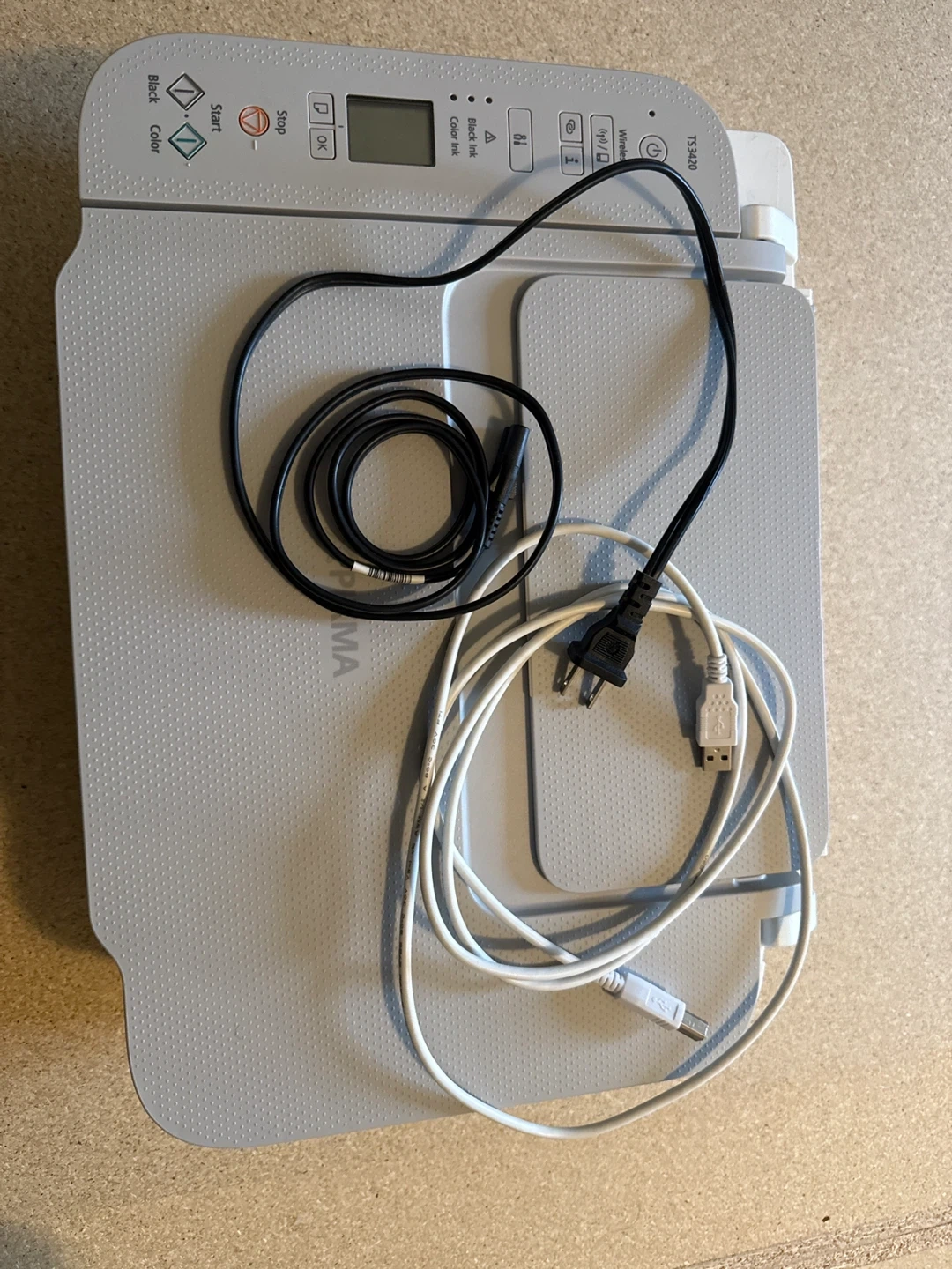Selling a Canon PIXMA TS3420 multifunction printer. It comes with the power cable and USB cable. Perfect for home or small office use!