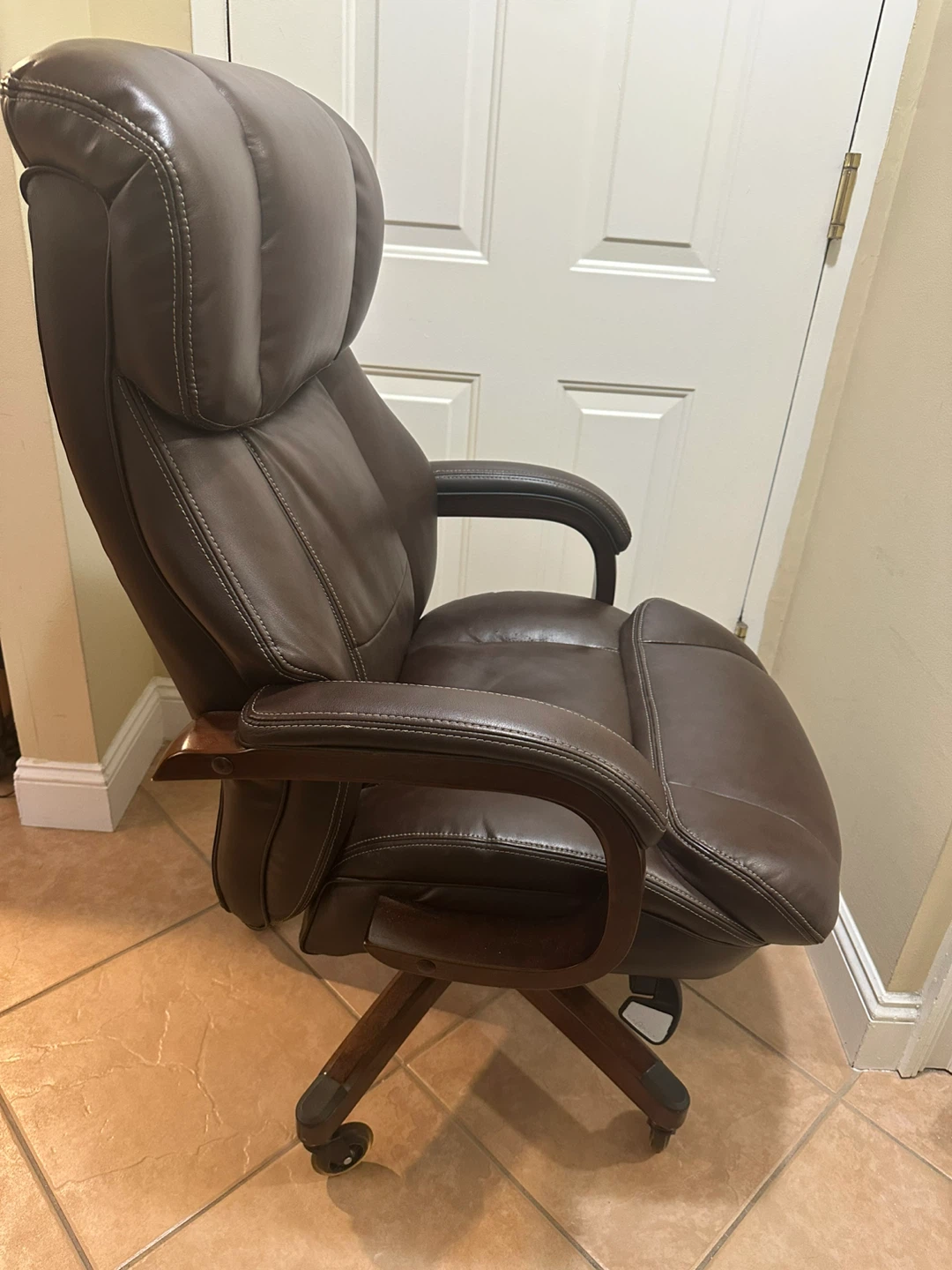 Selling a comfortable brown leather executive office chair. It's in good condition and perfect for a home office or study. The chair features a high back, padded armrests, and a sturdy base for support.