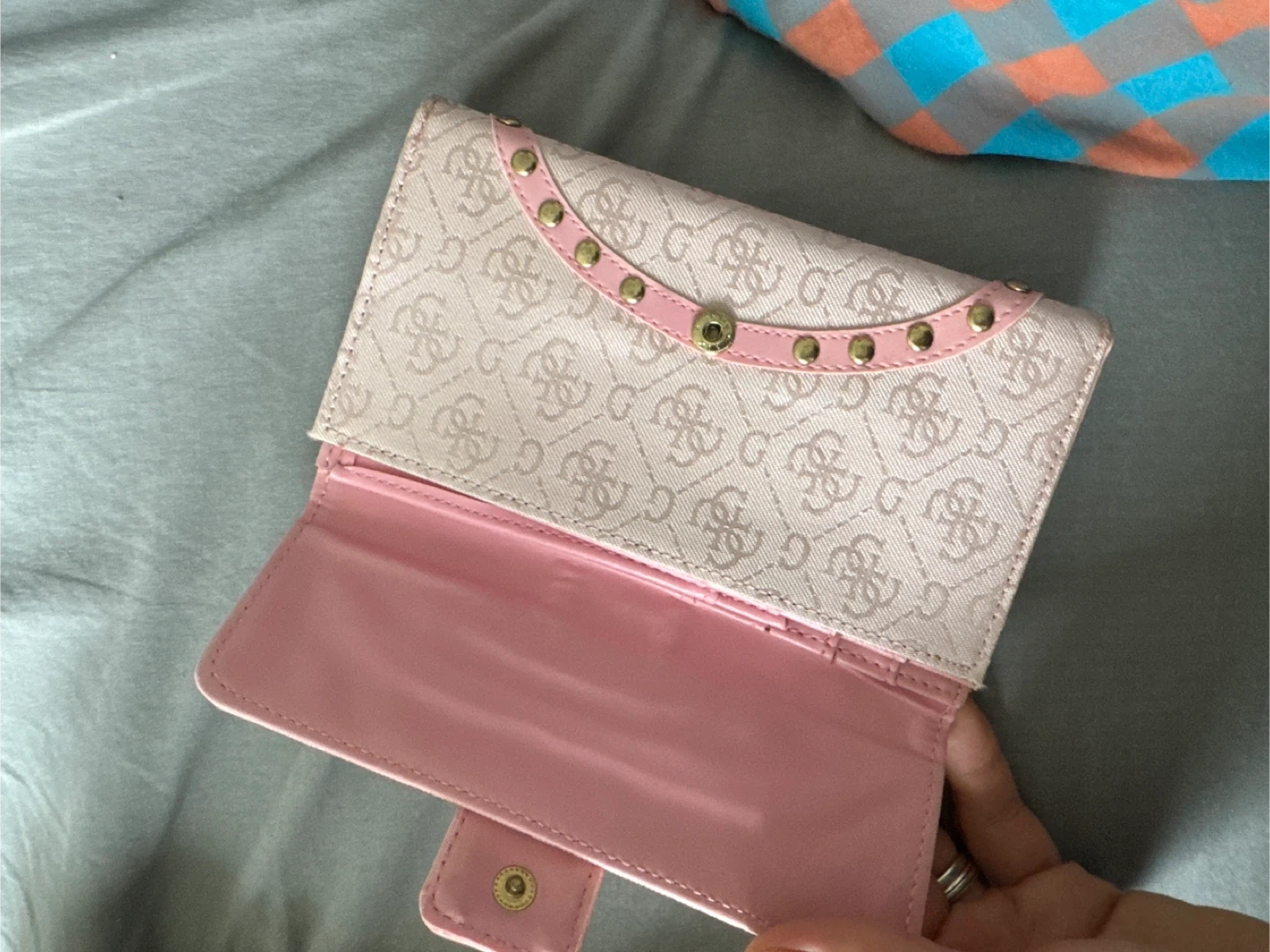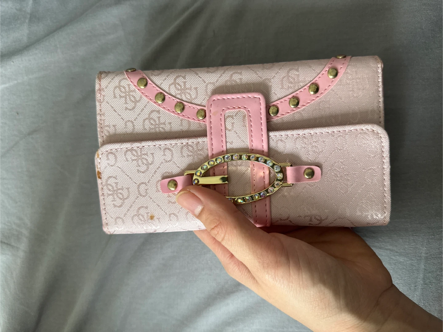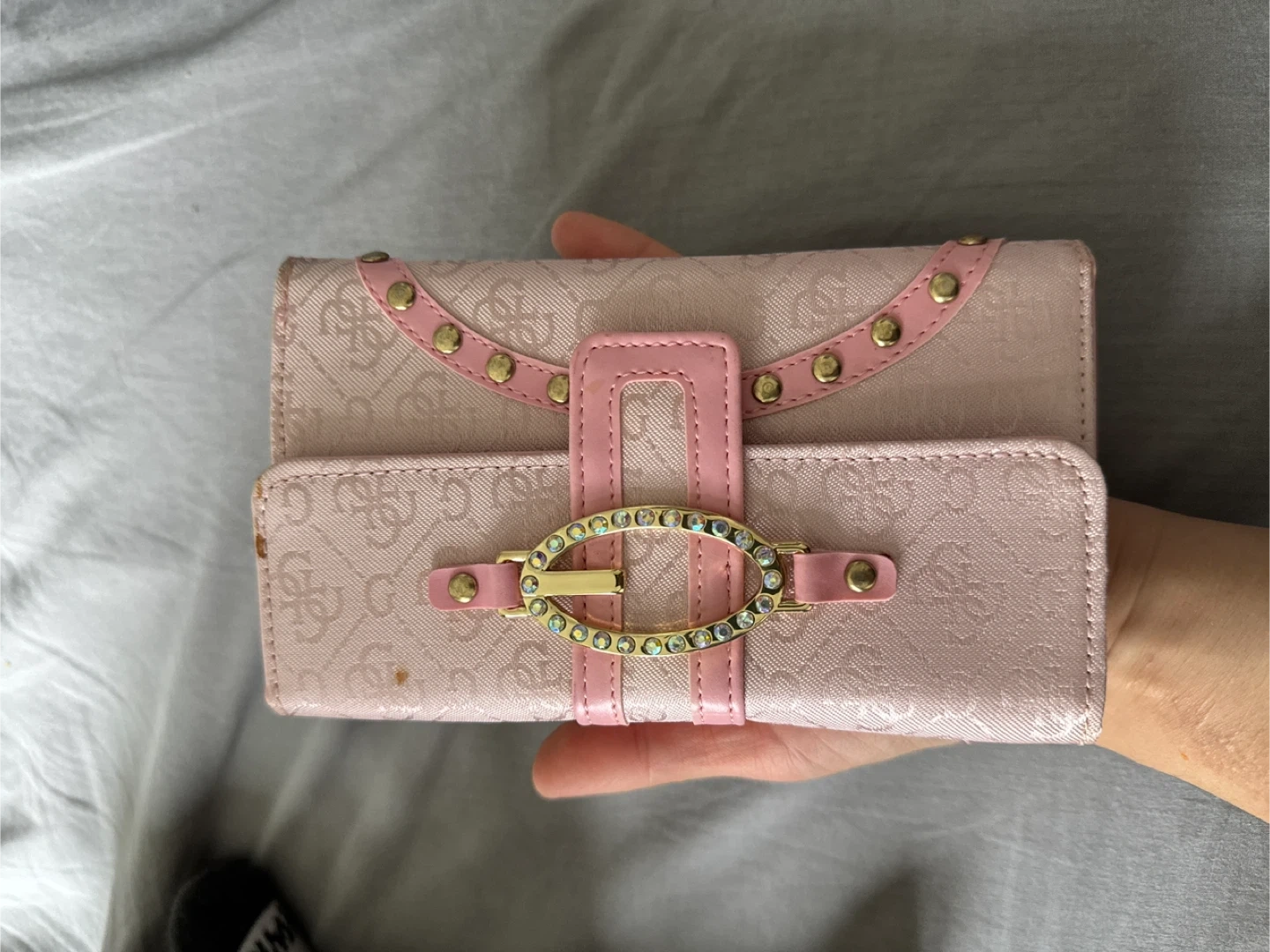 Selling a cute Guess wallet in pink! It's perfect for keeping your cards and cash organized. It has a unique design with a decorative buckle.