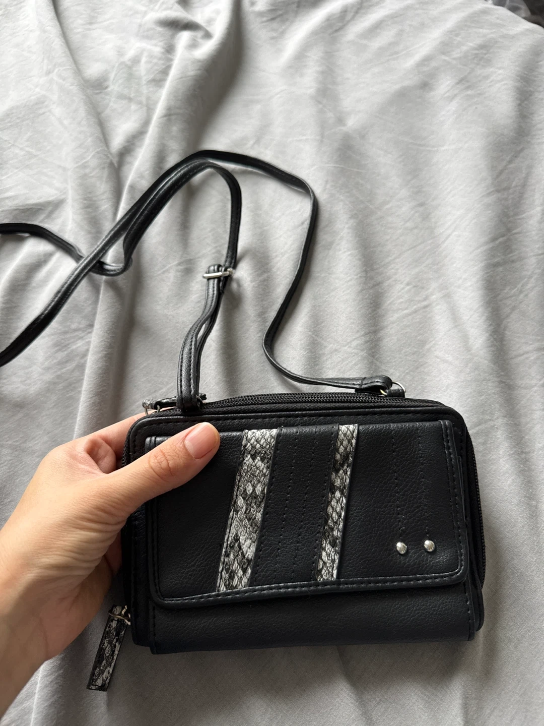 Selling a cute black crossbody wallet! It features snake print detailing and is perfect for carrying your essentials on the go. It's in great condition and ready for a new home!