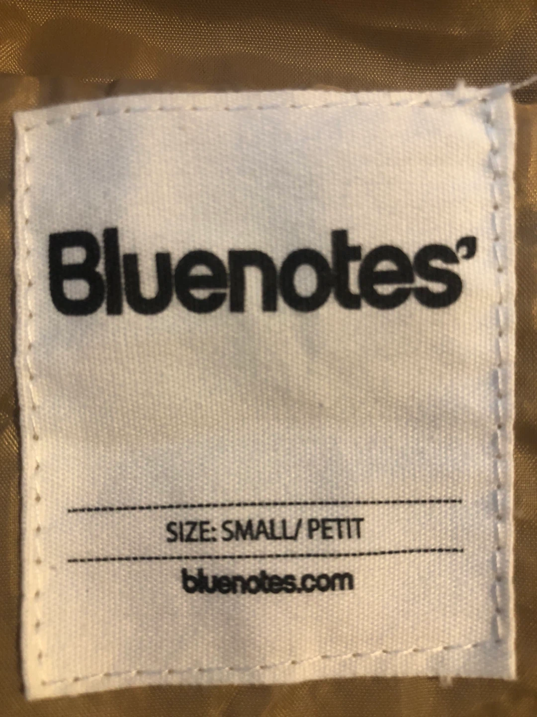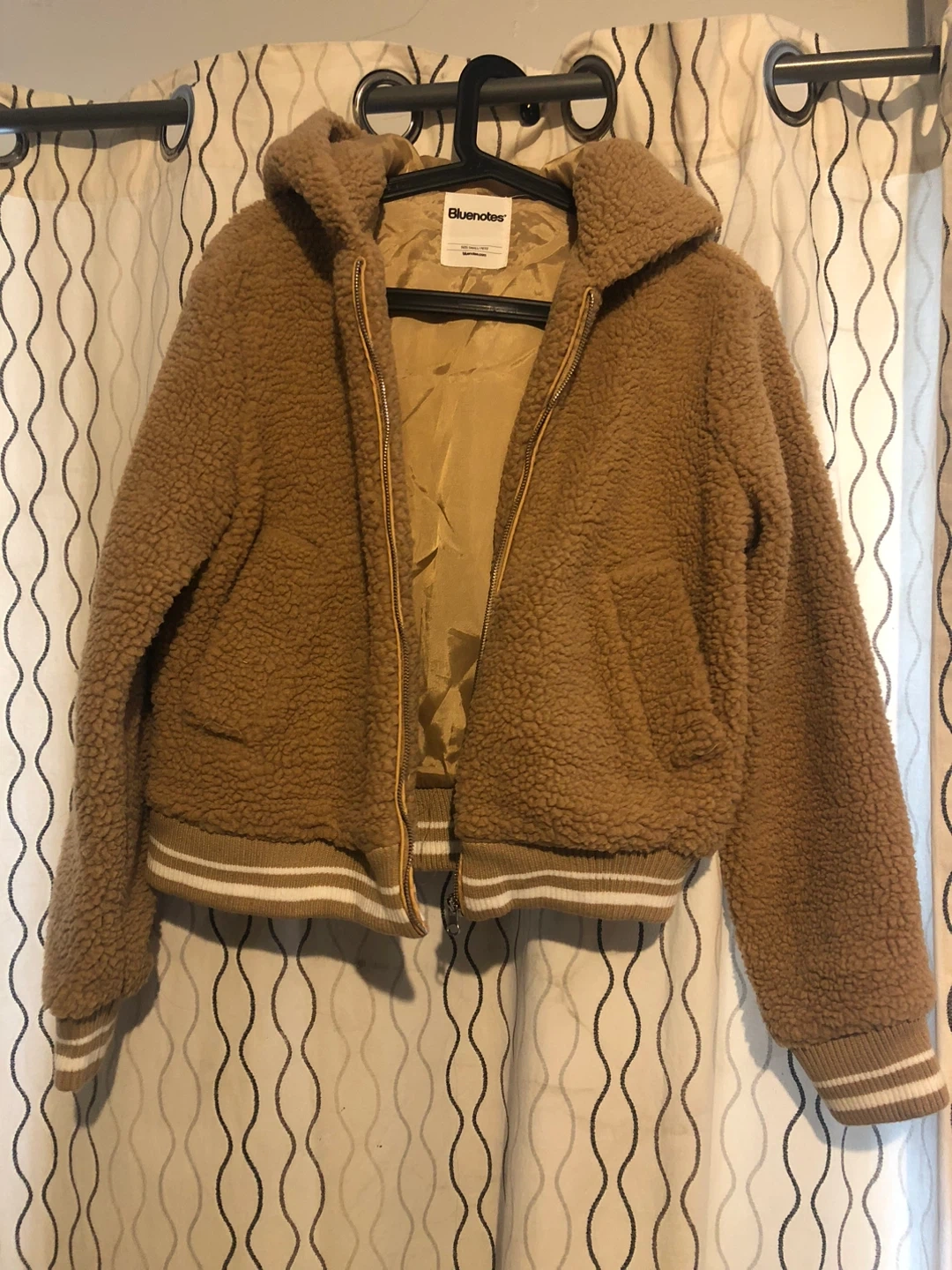 Cozy up in this Bluenotes teddy fleece jacket! It's a size small and features a hood, zipper closure, and cute striped detailing on the cuffs and hem. Perfect for those chilly Canadian evenings!
