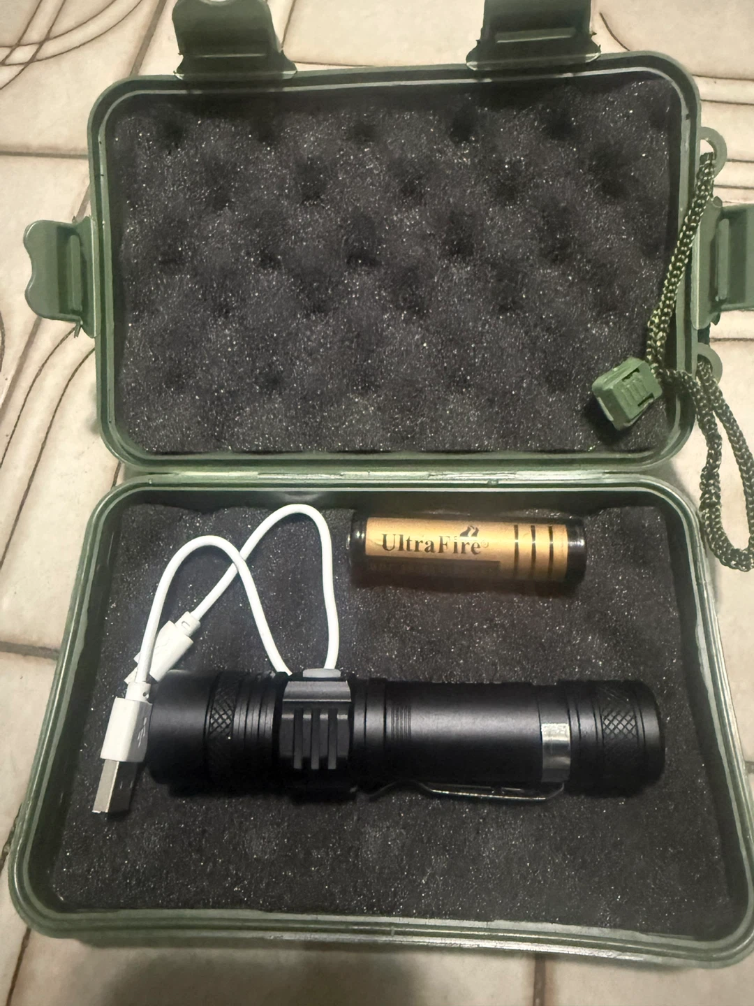 Selling an UltraFire tactical flashlight. It comes with its battery, charging cable, and a protective case. Great for camping, patrolling, or emergencies!