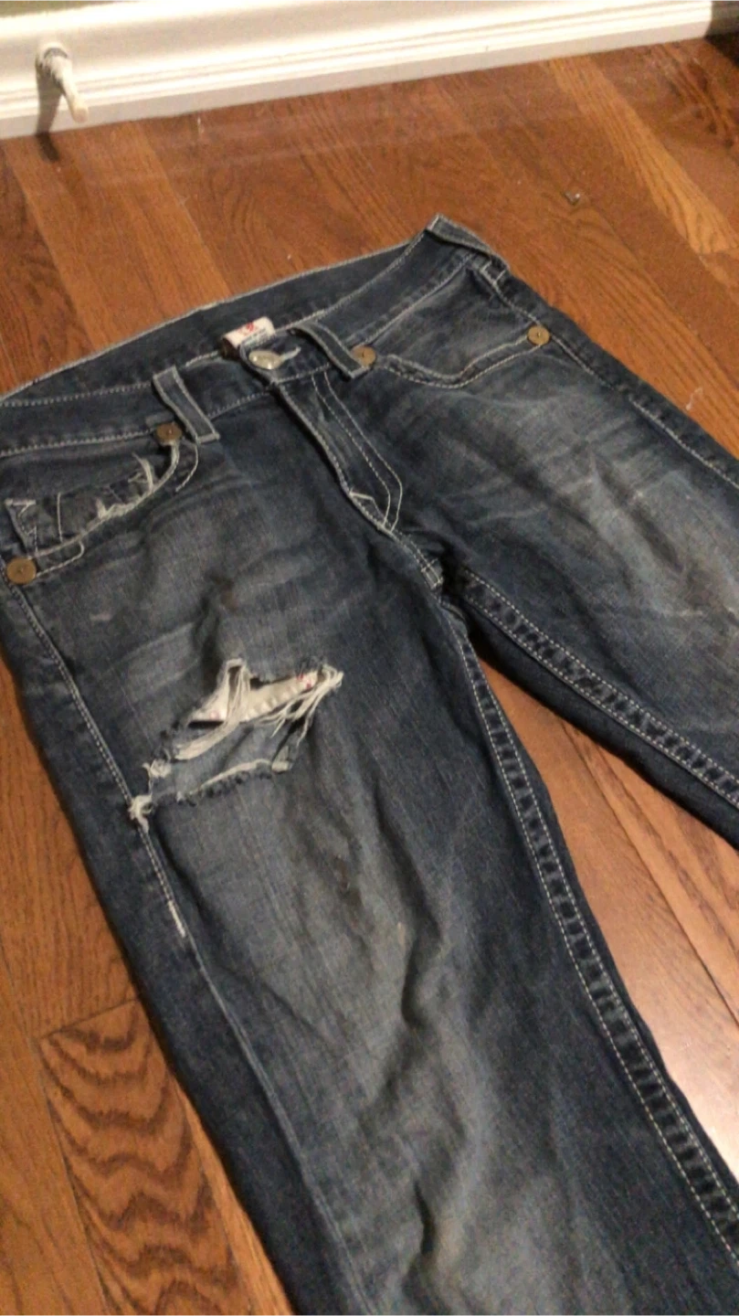 Selling a pair of True Religion jeans in size 32. They have some wear and tear, including a rip on the leg and some stains. Please see the photos for details!