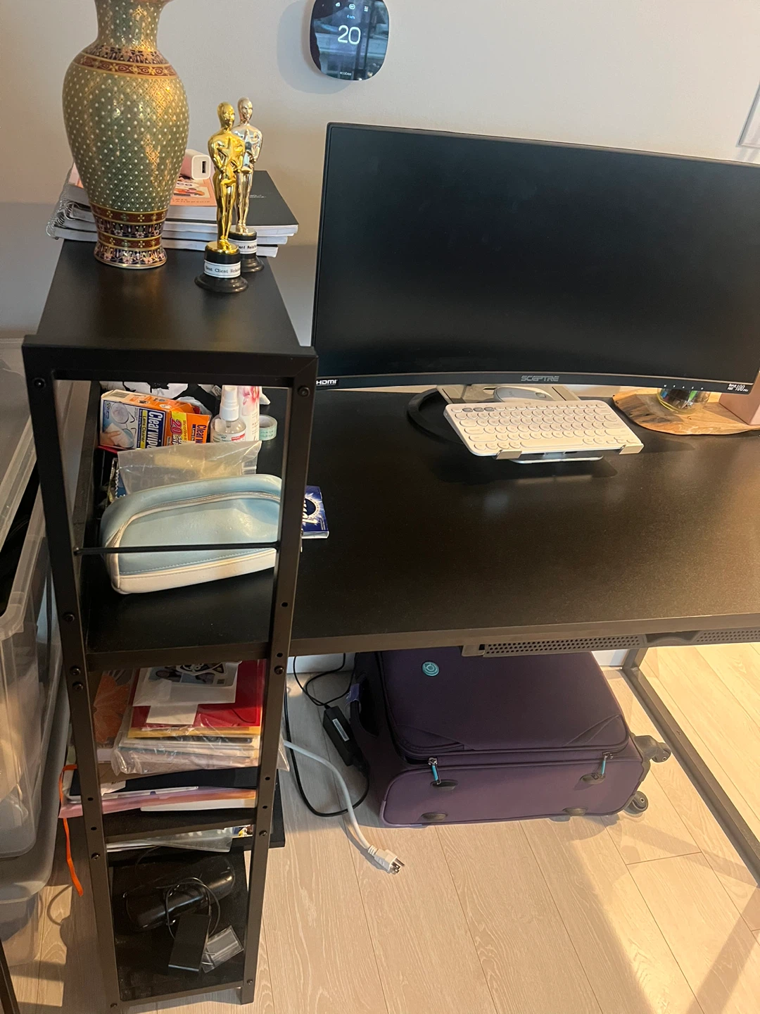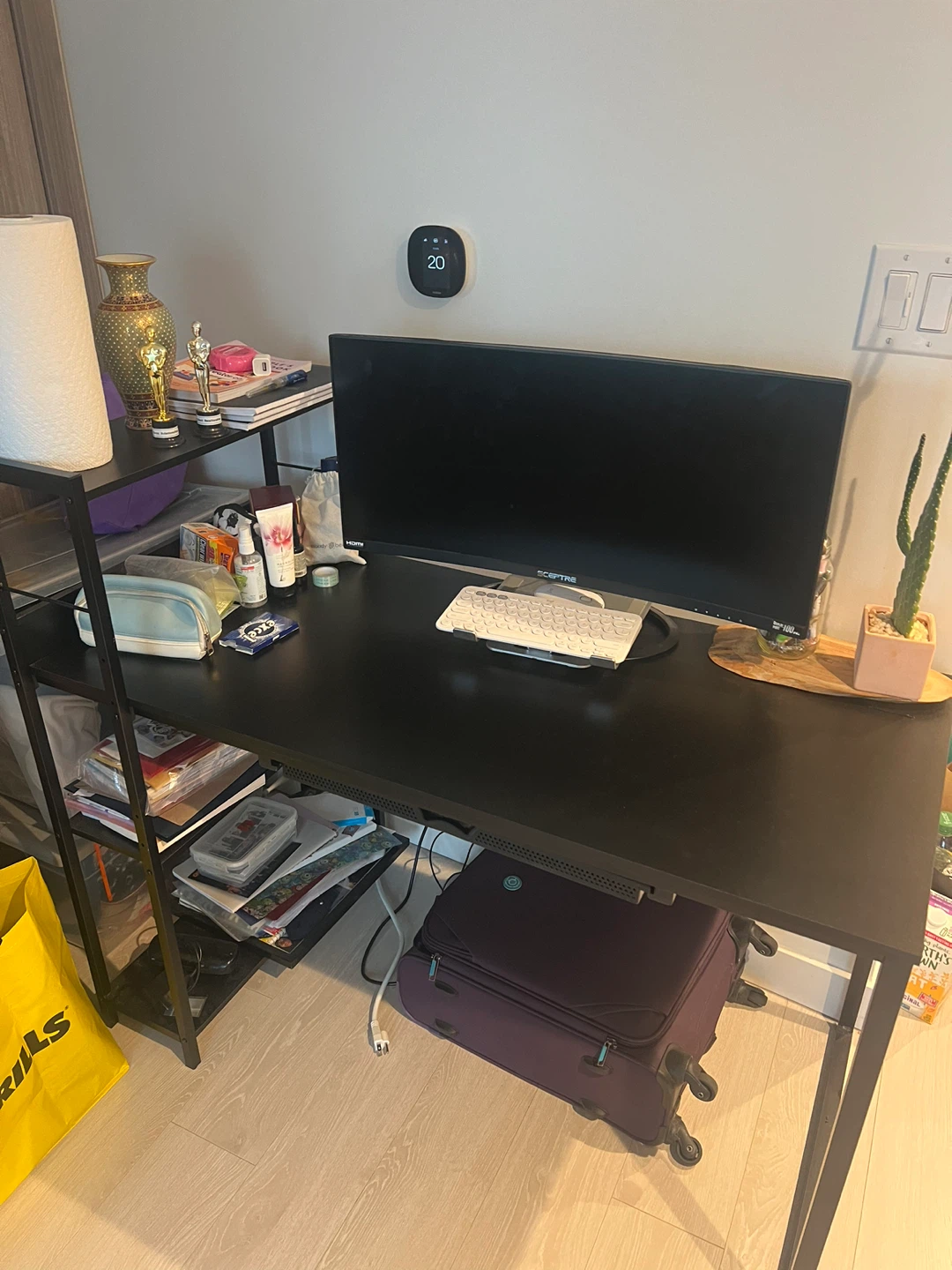 Selling a black desk that comes with attached shelving! It's perfect for a home office or study space. The shelves provide extra storage for books, supplies, or decor. It's in great condition and ready for a new home!