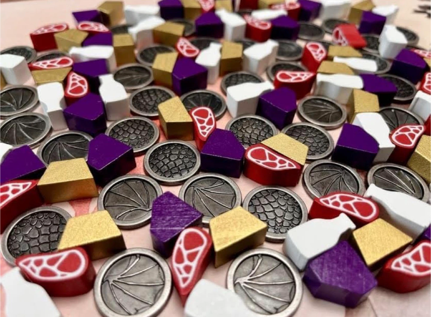 Stonemaier Games: Wyrmspan Upgrade Pack | Metal Coins and Wooden Resources | 45 Double-Sided Metal Dragon Coins and 104 Wooden Resources (Meat, Gold, gem, and Milk) - Add to Wyrmspan