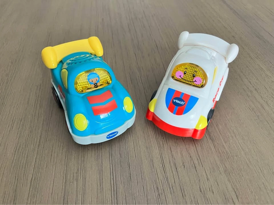 Vtech Race Cars, selling as a set of 2. Requires batteries. For use with any vtech racing set (for the full effect) or on their own.
