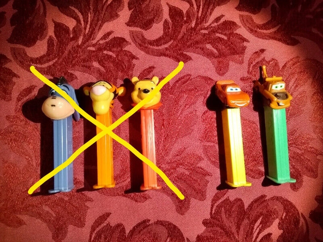 Collectable Pez Dispensers. Loose. Eeyore, Tigger, Winnie the Pooh = SOLD $3 each (or $5 for both) -Mater: introduced in 2011. Retired. - Lightning McQueen: introduced in 2011. Retired. Disney. Pixar. See my other ads for other Pez. Smoke free home. Pick up near Banwell and the Expressway.