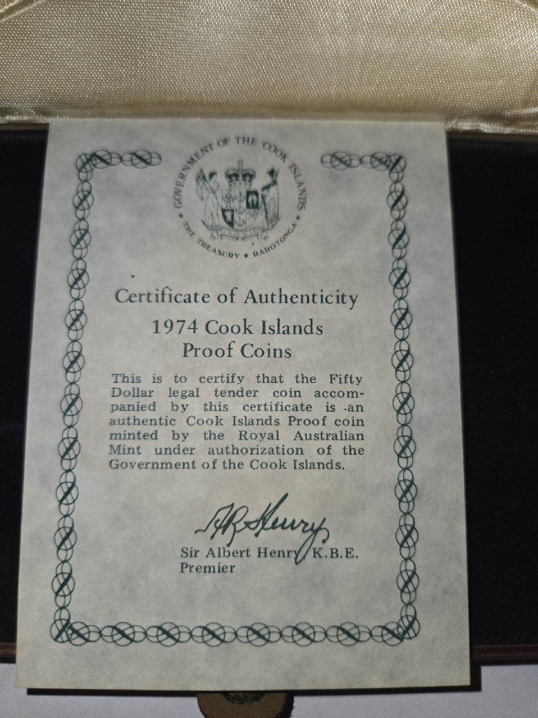 Selling a 1974 Cook Islands Fifty Dollar legal tender coin. It's an authentic Cook Islands Proof coin minted by the Royal Australian Mint under authorization of the Government of the Cook Islands. Comes with a Certificate of Authenticity.