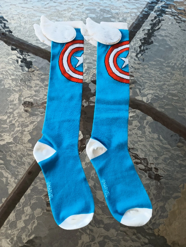 Captain America Socks. Like new. Estimated to fit adult shoe size 5-9 (stretchy). Knee high with 3D wings. Pick up near Banwell and the Expressway.