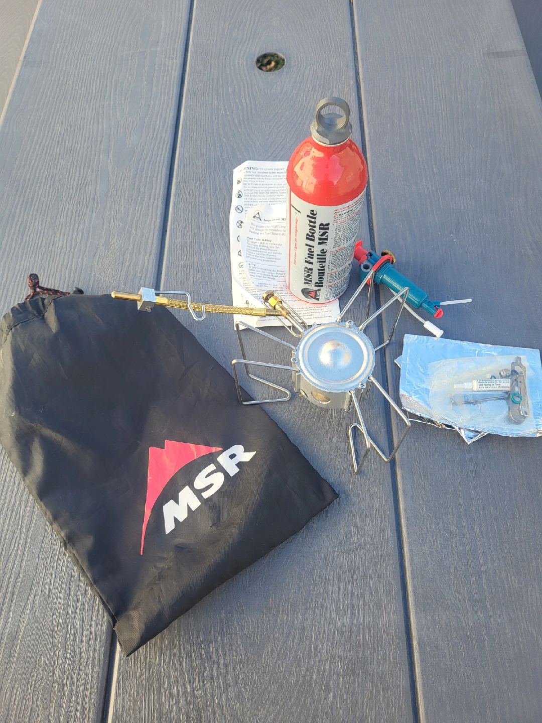 Selling an MSR backpacking stove, fuel bottle and improved pump plunger, plus manual and accessories. Great for camping and outdoor adventures! Comes with the original bag and instructions.