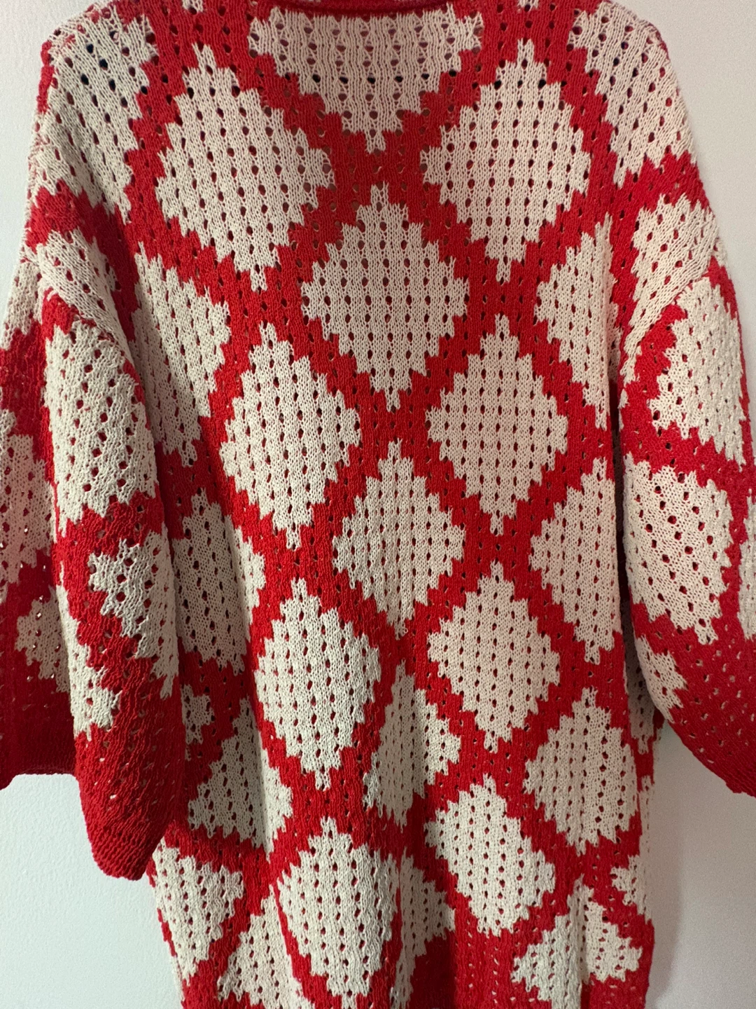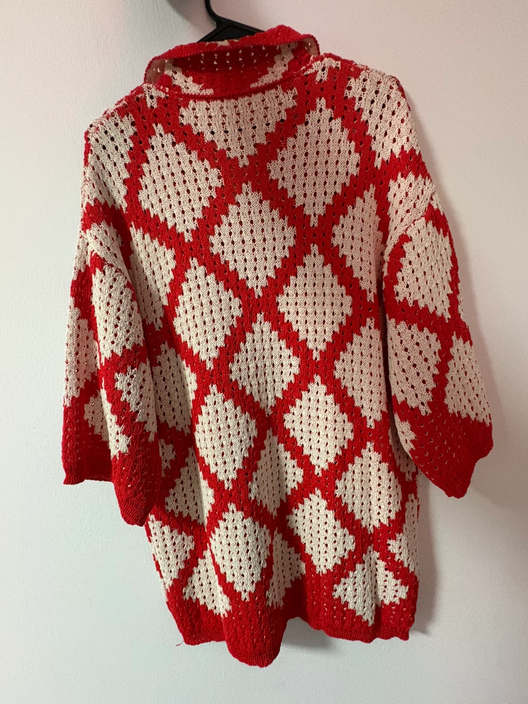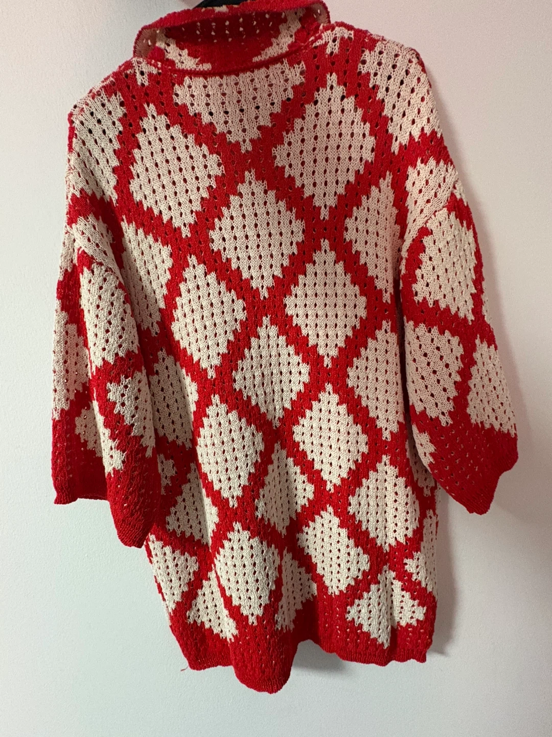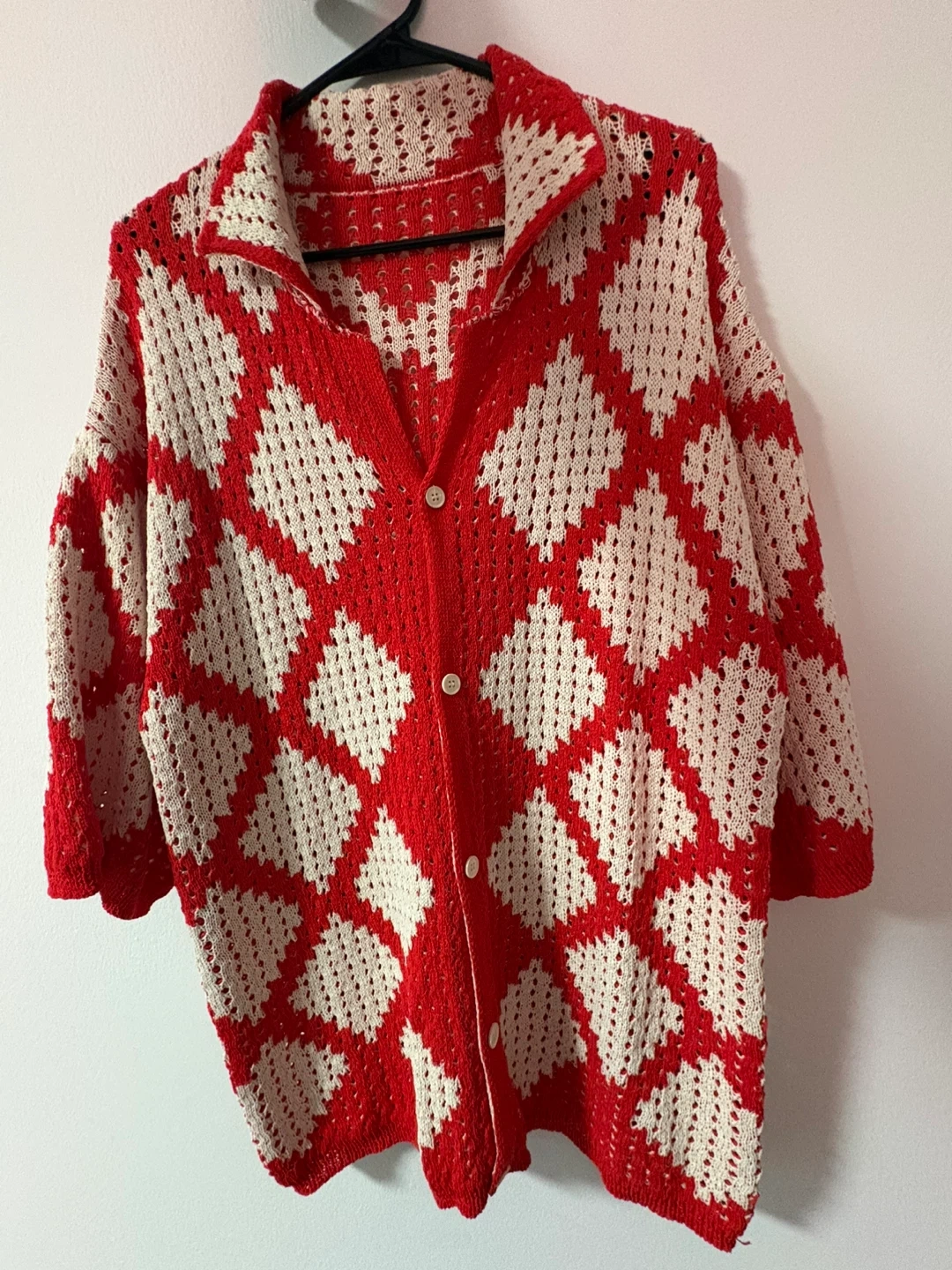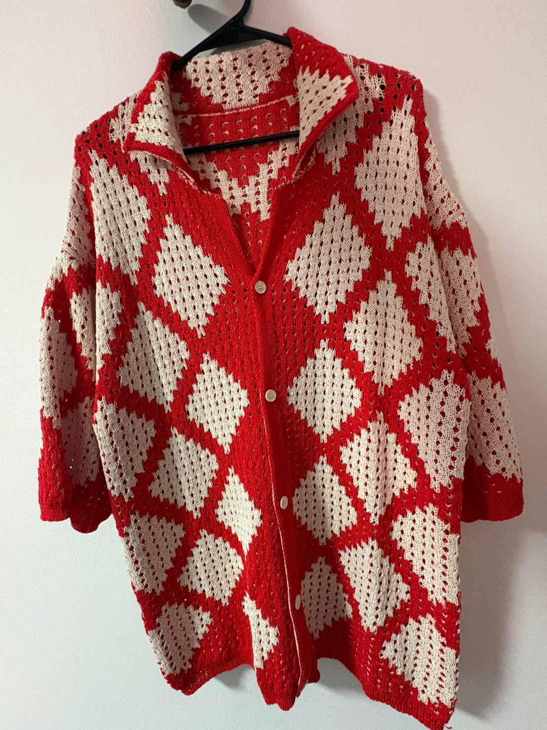 Selling a cozy knit shirt, with a unique red and white diamond pattern. It's a button-up style with a collared neckline and three-quarter sleeves. Perfect for layering on cooler days!