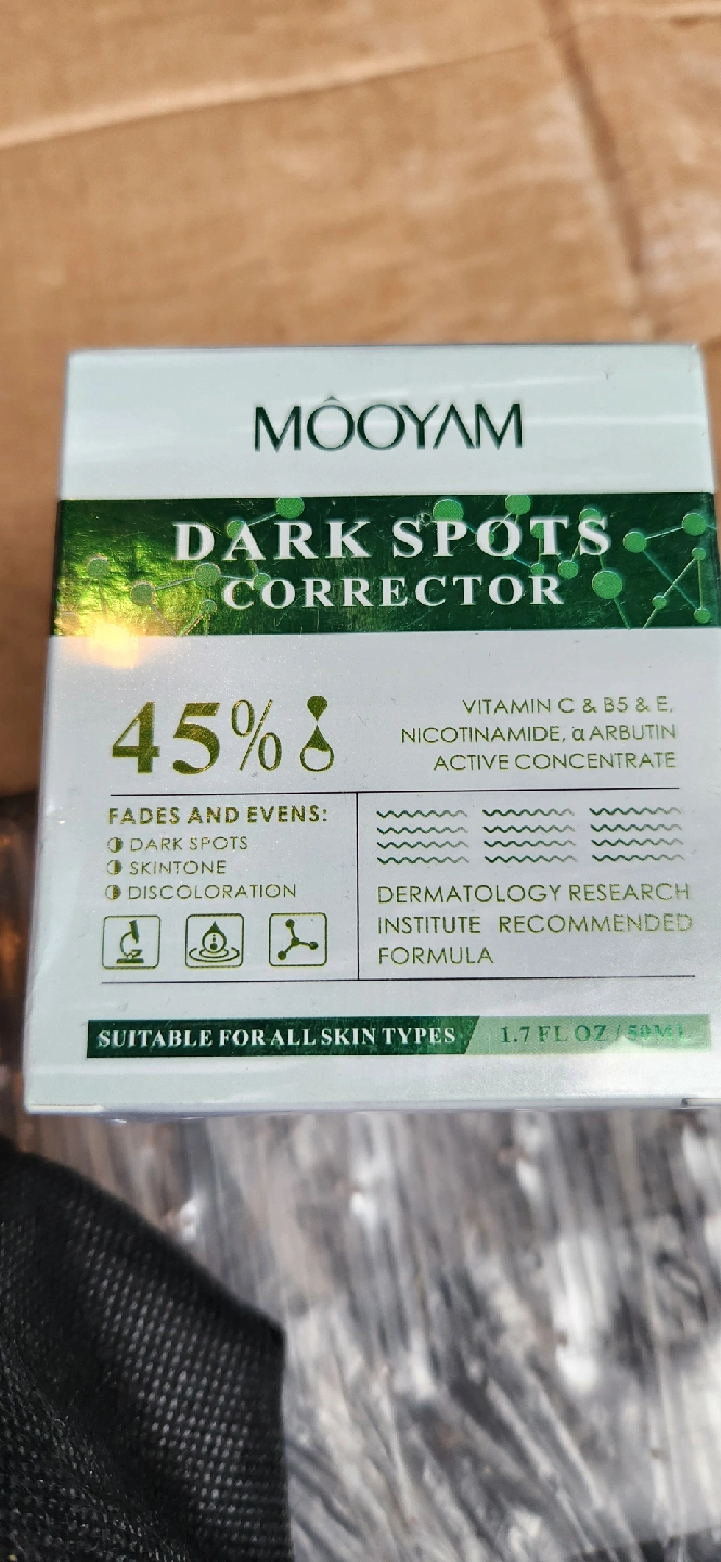 I'm selling a brand new Mooyam Dark Spots Corrector! It's suitable for all skin types and comes in a 1.7 fl oz / 50 ml size. This corrector fades dark spots, evens skintone, and helps with discoloration. It's a dermatologist research institute recommended formula containing Vitamin C & B5 & E, Nicotinamide, and α Arbutin active concentrate