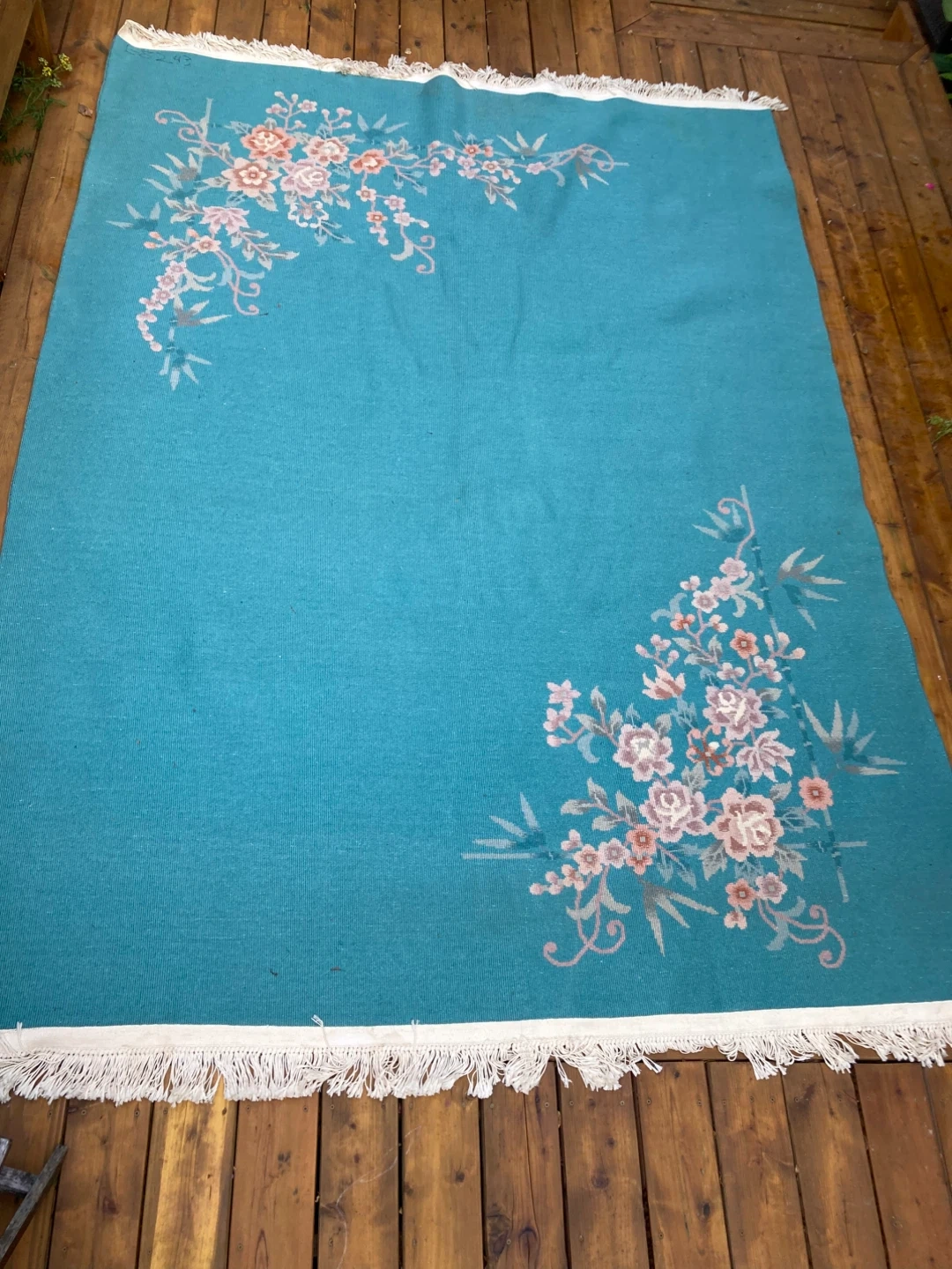 Very high quality oriental wool rug with dense pile and beautiful floral accents. Could use a cleaning, but otherwise in impeccable structural condition. No room to store this and we are preparing to downsize ….this is truly a bargain price for someone seeking to warm up their living space with a tasteful oriental rug.